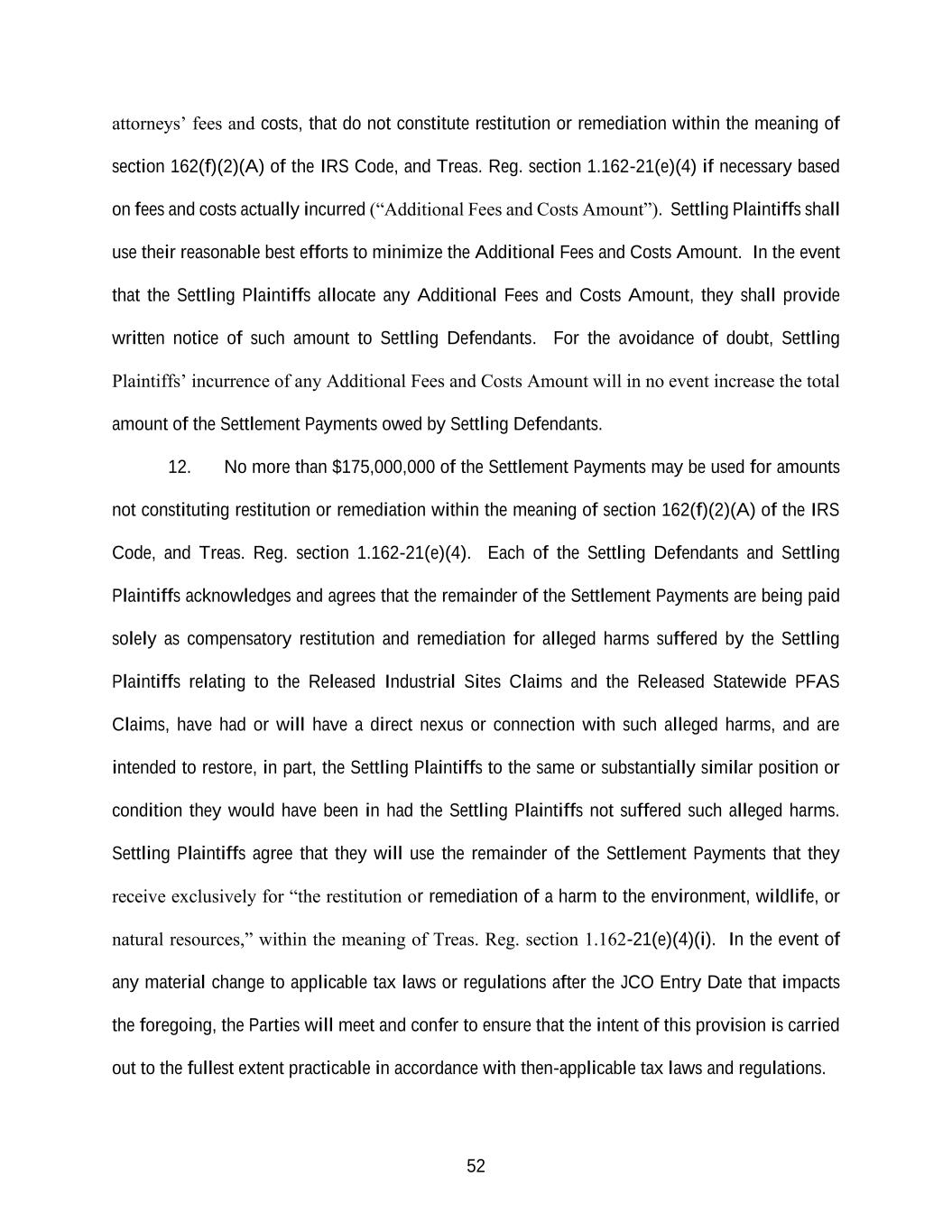52 attorneys’ fees and costs, that do not constitute restitution or remediation within the meaning of section 162(f)(2)(A) of the IRS Code, and Treas. Reg. section 1.162-21(e)(4) if necessary based on fees and costs actually incurred (“Additional Fees and Costs Amount”). Settling Plaintiffs shall use their reasonable best efforts to minimize the Additional Fees and Costs Amount. In the event that the Settling Plaintiffs allocate any Additional Fees and Costs Amount, they shall provide written notice of such amount to Settling Defendants. For the avoidance of doubt, Settling Plaintiffs’ incurrence of any Additional Fees and Costs Amount will in no event increase the total amount of the Settlement Payments owed by Settling Defendants. 12. No more than $175,000,000 of the Settlement Payments may be used for amounts not constituting restitution or remediation within the meaning of section 162(f)(2)(A) of the IRS Code, and Treas. Reg. section 1.162-21(e)(4). Each of the Settling Defendants and Settling Plaintiffs acknowledges and agrees that the remainder of the Settlement Payments are being paid solely as compensatory restitution and remediation for alleged harms suffered by the Settling Plaintiffs relating to the Released Industrial Sites Claims and the Released Statewide PFAS Claims, have had or will have a direct nexus or connection with such alleged harms, and are intended to restore, in part, the Settling Plaintiffs to the same or substantially similar position or condition they would have been in had the Settling Plaintiffs not suffered such alleged harms. Settling Plaintiffs agree that they will use the remainder of the Settlement Payments that they receive exclusively for “the restitution or remediation of a harm to the environment, wildlife, or natural resources,” within the meaning of Treas. Reg. section 1.162-21(e)(4)(i). In the event of any material change to applicable tax laws or regulations after the JCO Entry Date that impacts the foregoing, the Parties will meet and confer to ensure that the intent of this provision is carried out to the fullest extent practicable in accordance with then-applicable tax laws and regulations.