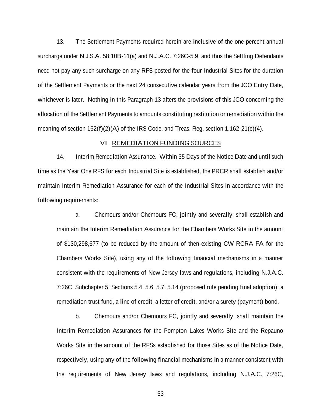 53 13. The Settlement Payments required herein are inclusive of the one percent annual surcharge under N.J.S.A. 58:10B-11(a) and N.J.A.C. 7:26C-5.9, and thus the Settling Defendants need not pay any such surcharge on any RFS posted for the four Industrial Sites for the duration of the Settlement Payments or the next 24 consecutive calendar years from the JCO Entry Date, whichever is later. Nothing in this Paragraph 13 alters the provisions of this JCO concerning the allocation of the Settlement Payments to amounts constituting restitution or remediation within the meaning of section 162(f)(2)(A) of the IRS Code, and Treas. Reg. section 1.162-21(e)(4). VI. REMEDIATION FUNDING SOURCES 14. Interim Remediation Assurance. Within 35 Days of the Notice Date and until such time as the Year One RFS for each Industrial Site is established, the PRCR shall establish and/or maintain Interim Remediation Assurance for each of the Industrial Sites in accordance with the following requirements: a. Chemours and/or Chemours FC, jointly and severally, shall establish and maintain the Interim Remediation Assurance for the Chambers Works Site in the amount of $130,298,677 (to be reduced by the amount of then-existing CW RCRA FA for the Chambers Works Site), using any of the following financial mechanisms in a manner consistent with the requirements of New Jersey laws and regulations, including N.J.A.C. 7:26C, Subchapter 5, Sections 5.4, 5.6, 5.7, 5.14 (proposed rule pending final adoption): a remediation trust fund, a line of credit, a letter of credit, and/or a surety (payment) bond. b. Chemours and/or Chemours FC, jointly and severally, shall maintain the Interim Remediation Assurances for the Pompton Lakes Works Site and the Repauno Works Site in the amount of the RFSs established for those Sites as of the Notice Date, respectively, using any of the following financial mechanisms in a manner consistent with the requirements of New Jersey laws and regulations, including N.J.A.C. 7:26C,