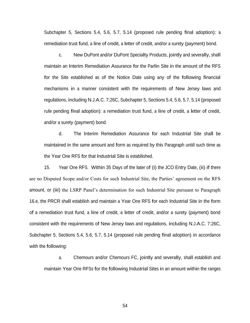 54 Subchapter 5, Sections 5.4, 5.6, 5.7, 5.14 (proposed rule pending final adoption): a remediation trust fund, a line of credit, a letter of credit, and/or a surety (payment) bond. c. New DuPont and/or DuPont Specialty Products, jointly and severally, shall maintain an Interim Remediation Assurance for the Parlin Site in the amount of the RFS for the Site established as of the Notice Date using any of the following financial mechanisms in a manner consistent with the requirements of New Jersey laws and regulations, including N.J.A.C. 7:26C, Subchapter 5, Sections 5.4, 5.6, 5.7, 5.14 (proposed rule pending final adoption): a remediation trust fund, a line of credit, a letter of credit, and/or a surety (payment) bond. d. The Interim Remediation Assurance for each Industrial Site shall be maintained in the same amount and form as required by this Paragraph until such time as the Year One RFS for that Industrial Site is established. 15. Year One RFS. Within 35 Days of the later of (i) the JCO Entry Date, (ii) if there are no Disputed Scope and/or Costs for such Industrial Site, the Parties’ agreement on the RFS amount, or (iii) the LSRP Panel’s determination for such Industrial Site pursuant to Paragraph 16.e, the PRCR shall establish and maintain a Year One RFS for each Industrial Site in the form of a remediation trust fund, a line of credit, a letter of credit, and/or a surety (payment) bond consistent with the requirements of New Jersey laws and regulations, including N.J.A.C. 7:26C, Subchapter 5, Sections 5.4, 5.6, 5.7, 5.14 (proposed rule pending final adoption) in accordance with the following: a. Chemours and/or Chemours FC, jointly and severally, shall establish and maintain Year One RFSs for the following Industrial Sites in an amount within the ranges