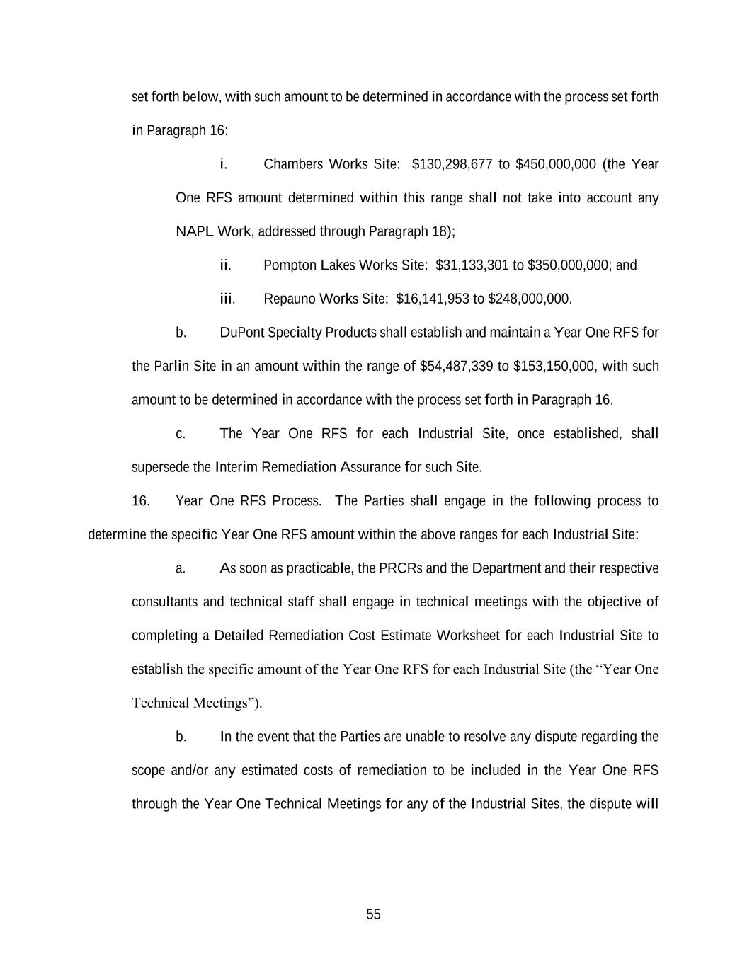 55 set forth below, with such amount to be determined in accordance with the process set forth in Paragraph 16: i. Chambers Works Site: $130,298,677 to $450,000,000 (the Year One RFS amount determined within this range shall not take into account any NAPL Work, addressed through Paragraph 18); ii. Pompton Lakes Works Site: $31,133,301 to $350,000,000; and iii. Repauno Works Site: $16,141,953 to $248,000,000. b. DuPont Specialty Products shall establish and maintain a Year One RFS for the Parlin Site in an amount within the range of $54,487,339 to $153,150,000, with such amount to be determined in accordance with the process set forth in Paragraph 16. c. The Year One RFS for each Industrial Site, once established, shall supersede the Interim Remediation Assurance for such Site. 16. Year One RFS Process. The Parties shall engage in the following process to determine the specific Year One RFS amount within the above ranges for each Industrial Site: a. As soon as practicable, the PRCRs and the Department and their respective consultants and technical staff shall engage in technical meetings with the objective of completing a Detailed Remediation Cost Estimate Worksheet for each Industrial Site to establish the specific amount of the Year One RFS for each Industrial Site (the “Year One Technical Meetings”). b. In the event that the Parties are unable to resolve any dispute regarding the scope and/or any estimated costs of remediation to be included in the Year One RFS through the Year One Technical Meetings for any of the Industrial Sites, the dispute will