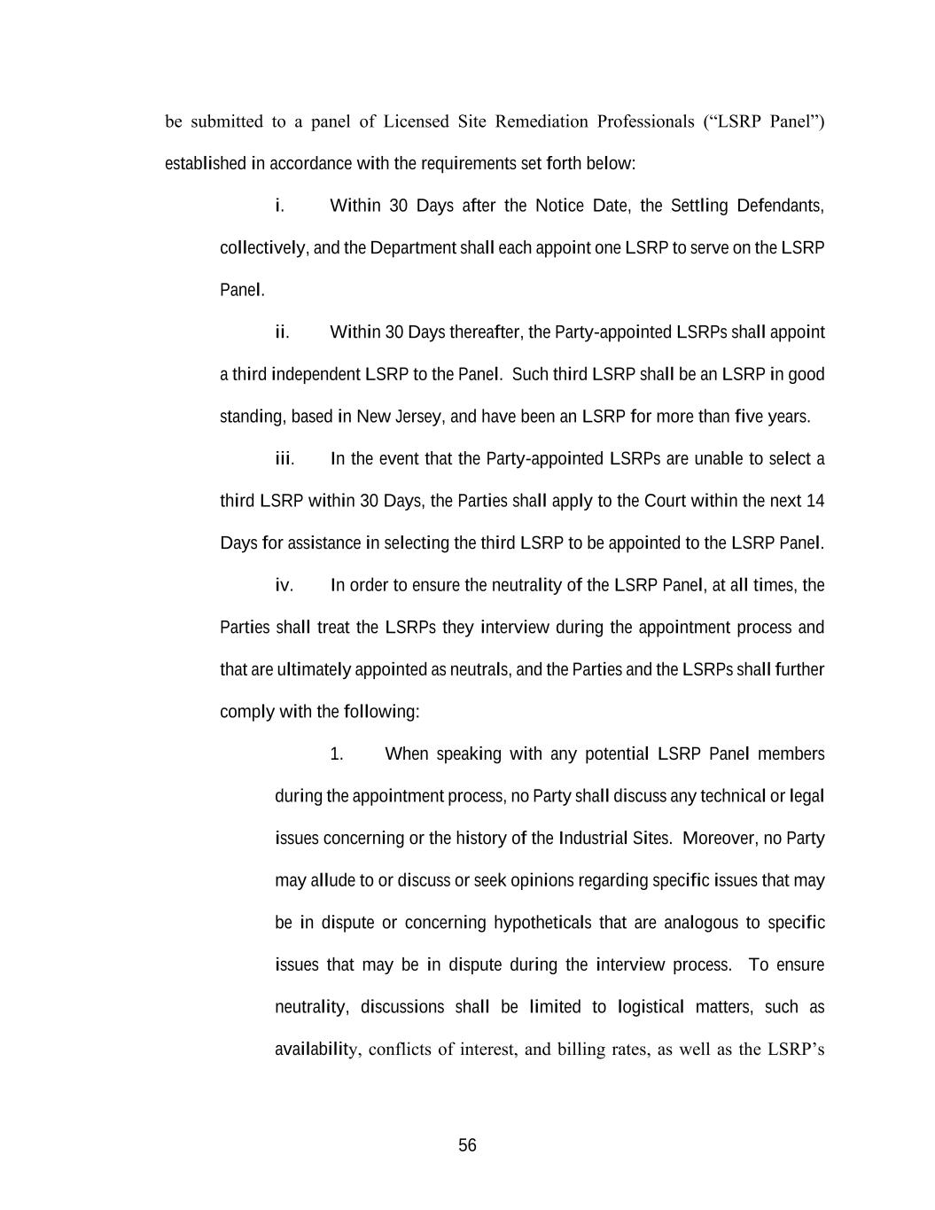56 be submitted to a panel of Licensed Site Remediation Professionals (“LSRP Panel”) established in accordance with the requirements set forth below: i. Within 30 Days after the Notice Date, the Settling Defendants, collectively, and the Department shall each appoint one LSRP to serve on the LSRP Panel. ii. Within 30 Days thereafter, the Party-appointed LSRPs shall appoint a third independent LSRP to the Panel. Such third LSRP shall be an LSRP in good standing, based in New Jersey, and have been an LSRP for more than five years. iii. In the event that the Party-appointed LSRPs are unable to select a third LSRP within 30 Days, the Parties shall apply to the Court within the next 14 Days for assistance in selecting the third LSRP to be appointed to the LSRP Panel. iv. In order to ensure the neutrality of the LSRP Panel, at all times, the Parties shall treat the LSRPs they interview during the appointment process and that are ultimately appointed as neutrals, and the Parties and the LSRPs shall further comply with the following: 1. When speaking with any potential LSRP Panel members during the appointment process, no Party shall discuss any technical or legal issues concerning or the history of the Industrial Sites. Moreover, no Party may allude to or discuss or seek opinions regarding specific issues that may be in dispute or concerning hypotheticals that are analogous to specific issues that may be in dispute during the interview process. To ensure neutrality, discussions shall be limited to logistical matters, such as availability, conflicts of interest, and billing rates, as well as the LSRP’s