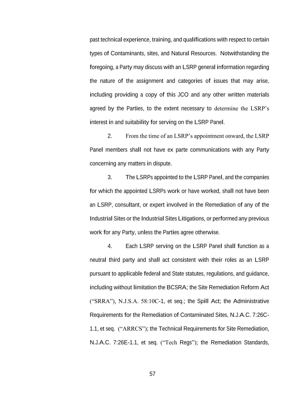 57 past technical experience, training, and qualifications with respect to certain types of Contaminants, sites, and Natural Resources. Notwithstanding the foregoing, a Party may discuss with an LSRP general information regarding the nature of the assignment and categories of issues that may arise, including providing a copy of this JCO and any other written materials agreed by the Parties, to the extent necessary to determine the LSRP’s interest in and suitability for serving on the LSRP Panel. 2. From the time of an LSRP’s appointment onward, the LSRP Panel members shall not have ex parte communications with any Party concerning any matters in dispute. 3. The LSRPs appointed to the LSRP Panel, and the companies for which the appointed LSRPs work or have worked, shall not have been an LSRP, consultant, or expert involved in the Remediation of any of the Industrial Sites or the Industrial Sites Litigations, or performed any previous work for any Party, unless the Parties agree otherwise. 4. Each LSRP serving on the LSRP Panel shall function as a neutral third party and shall act consistent with their roles as an LSRP pursuant to applicable federal and State statutes, regulations, and guidance, including without limitation the BCSRA; the Site Remediation Reform Act (“SRRA”), N.J.S.A. 58:10C-1, et seq.; the Spill Act; the Administrative Requirements for the Remediation of Contaminated Sites, N.J.A.C. 7:26C- 1.1, et seq. (“ARRCS”); the Technical Requirements for Site Remediation, N.J.A.C. 7:26E-1.1, et seq. (“Tech Regs”); the Remediation Standards,