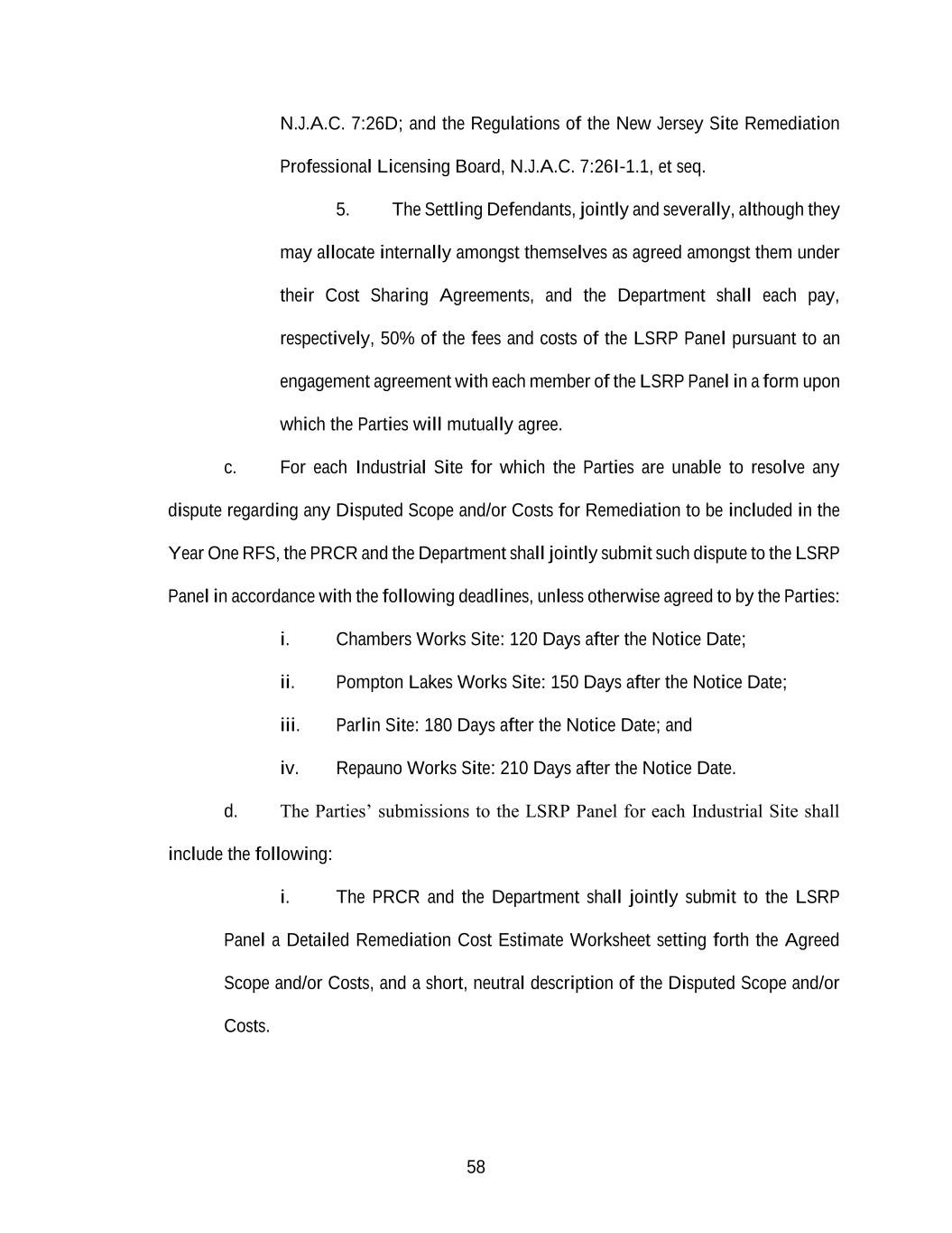 58 N.J.A.C. 7:26D; and the Regulations of the New Jersey Site Remediation Professional Licensing Board, N.J.A.C. 7:26I-1.1, et seq. 5. The Settling Defendants, jointly and severally, although they may allocate internally amongst themselves as agreed amongst them under their Cost Sharing Agreements, and the Department shall each pay, respectively, 50% of the fees and costs of the LSRP Panel pursuant to an engagement agreement with each member of the LSRP Panel in a form upon which the Parties will mutually agree. c. For each Industrial Site for which the Parties are unable to resolve any dispute regarding any Disputed Scope and/or Costs for Remediation to be included in the Year One RFS, the PRCR and the Department shall jointly submit such dispute to the LSRP Panel in accordance with the following deadlines, unless otherwise agreed to by the Parties: i. Chambers Works Site: 120 Days after the Notice Date; ii. Pompton Lakes Works Site: 150 Days after the Notice Date; iii. Parlin Site: 180 Days after the Notice Date; and iv. Repauno Works Site: 210 Days after the Notice Date. d. The Parties’ submissions to the LSRP Panel for each Industrial Site shall include the following: i. The PRCR and the Department shall jointly submit to the LSRP Panel a Detailed Remediation Cost Estimate Worksheet setting forth the Agreed Scope and/or Costs, and a short, neutral description of the Disputed Scope and/or Costs.