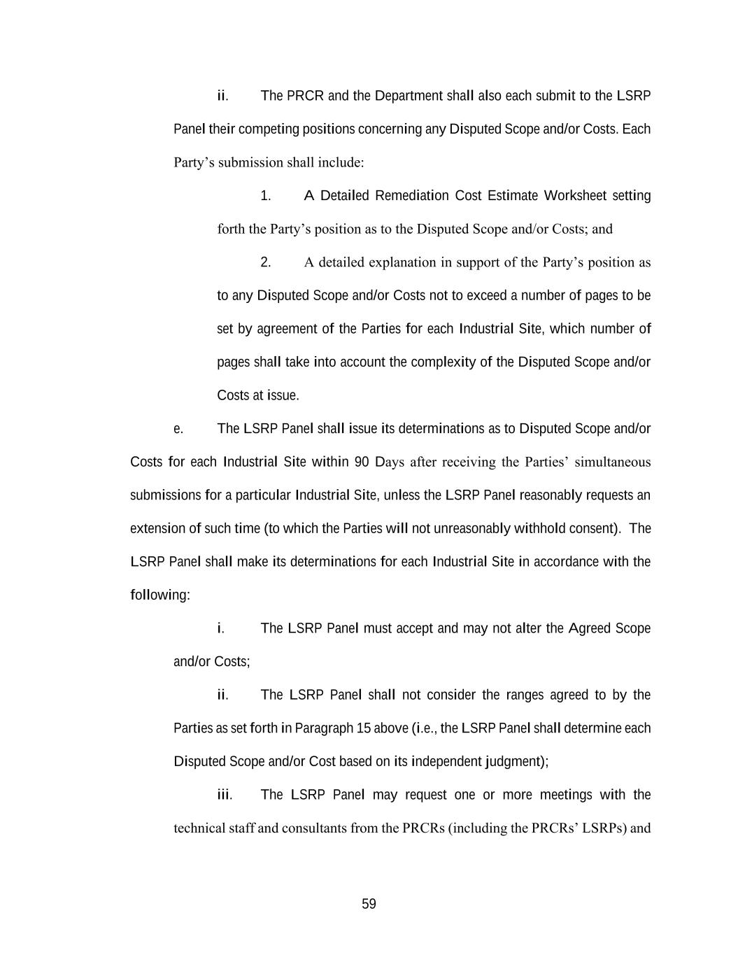 59 ii. The PRCR and the Department shall also each submit to the LSRP Panel their competing positions concerning any Disputed Scope and/or Costs. Each Party’s submission shall include: 1. A Detailed Remediation Cost Estimate Worksheet setting forth the Party’s position as to the Disputed Scope and/or Costs; and 2. A detailed explanation in support of the Party’s position as to any Disputed Scope and/or Costs not to exceed a number of pages to be set by agreement of the Parties for each Industrial Site, which number of pages shall take into account the complexity of the Disputed Scope and/or Costs at issue. e. The LSRP Panel shall issue its determinations as to Disputed Scope and/or Costs for each Industrial Site within 90 Days after receiving the Parties’ simultaneous submissions for a particular Industrial Site, unless the LSRP Panel reasonably requests an extension of such time (to which the Parties will not unreasonably withhold consent). The LSRP Panel shall make its determinations for each Industrial Site in accordance with the following: i. The LSRP Panel must accept and may not alter the Agreed Scope and/or Costs; ii. The LSRP Panel shall not consider the ranges agreed to by the Parties as set forth in Paragraph 15 above (i.e., the LSRP Panel shall determine each Disputed Scope and/or Cost based on its independent judgment); iii. The LSRP Panel may request one or more meetings with the technical staff and consultants from the PRCRs (including the PRCRs’ LSRPs) and