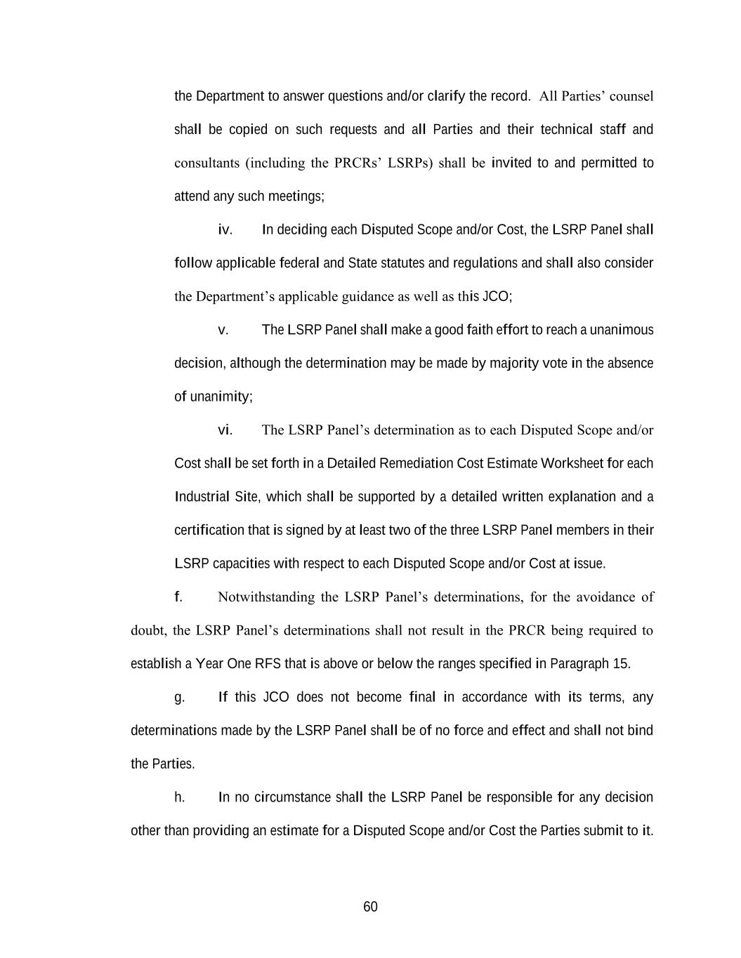60 the Department to answer questions and/or clarify the record. All Parties’ counsel shall be copied on such requests and all Parties and their technical staff and consultants (including the PRCRs’ LSRPs) shall be invited to and permitted to attend any such meetings; iv. In deciding each Disputed Scope and/or Cost, the LSRP Panel shall follow applicable federal and State statutes and regulations and shall also consider the Department’s applicable guidance as well as this JCO; v. The LSRP Panel shall make a good faith effort to reach a unanimous decision, although the determination may be made by majority vote in the absence of unanimity; vi. The LSRP Panel’s determination as to each Disputed Scope and/or Cost shall be set forth in a Detailed Remediation Cost Estimate Worksheet for each Industrial Site, which shall be supported by a detailed written explanation and a certification that is signed by at least two of the three LSRP Panel members in their LSRP capacities with respect to each Disputed Scope and/or Cost at issue. f. Notwithstanding the LSRP Panel’s determinations, for the avoidance of doubt, the LSRP Panel’s determinations shall not result in the PRCR being required to establish a Year One RFS that is above or below the ranges specified in Paragraph 15. g. If this JCO does not become final in accordance with its terms, any determinations made by the LSRP Panel shall be of no force and effect and shall not bind the Parties. h. In no circumstance shall the LSRP Panel be responsible for any decision other than providing an estimate for a Disputed Scope and/or Cost the Parties submit to it.