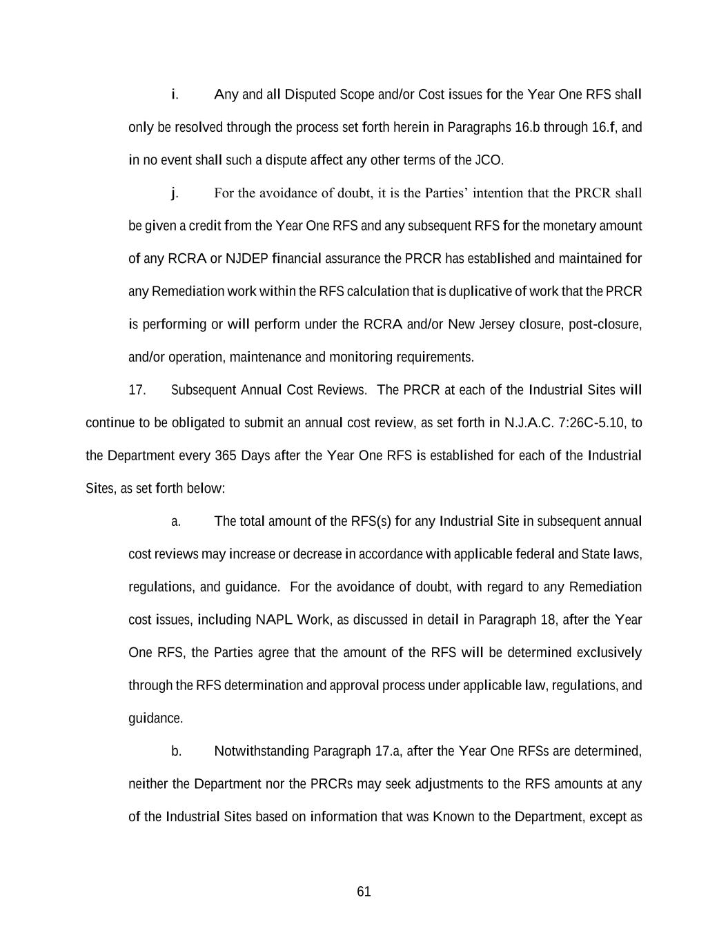 61 i. Any and all Disputed Scope and/or Cost issues for the Year One RFS shall only be resolved through the process set forth herein in Paragraphs 16.b through 16.f, and in no event shall such a dispute affect any other terms of the JCO. j. For the avoidance of doubt, it is the Parties’ intention that the PRCR shall be given a credit from the Year One RFS and any subsequent RFS for the monetary amount of any RCRA or NJDEP financial assurance the PRCR has established and maintained for any Remediation work within the RFS calculation that is duplicative of work that the PRCR is performing or will perform under the RCRA and/or New Jersey closure, post-closure, and/or operation, maintenance and monitoring requirements. 17. Subsequent Annual Cost Reviews. The PRCR at each of the Industrial Sites will continue to be obligated to submit an annual cost review, as set forth in N.J.A.C. 7:26C-5.10, to the Department every 365 Days after the Year One RFS is established for each of the Industrial Sites, as set forth below: a. The total amount of the RFS(s) for any Industrial Site in subsequent annual cost reviews may increase or decrease in accordance with applicable federal and State laws, regulations, and guidance. For the avoidance of doubt, with regard to any Remediation cost issues, including NAPL Work, as discussed in detail in Paragraph 18, after the Year One RFS, the Parties agree that the amount of the RFS will be determined exclusively through the RFS determination and approval process under applicable law, regulations, and guidance. b. Notwithstanding Paragraph 17.a, after the Year One RFSs are determined, neither the Department nor the PRCRs may seek adjustments to the RFS amounts at any of the Industrial Sites based on information that was Known to the Department, except as