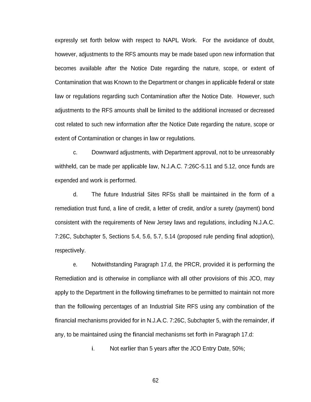 62 expressly set forth below with respect to NAPL Work. For the avoidance of doubt, however, adjustments to the RFS amounts may be made based upon new information that becomes available after the Notice Date regarding the nature, scope, or extent of Contamination that was Known to the Department or changes in applicable federal or state law or regulations regarding such Contamination after the Notice Date. However, such adjustments to the RFS amounts shall be limited to the additional increased or decreased cost related to such new information after the Notice Date regarding the nature, scope or extent of Contamination or changes in law or regulations. c. Downward adjustments, with Department approval, not to be unreasonably withheld, can be made per applicable law, N.J.A.C. 7:26C-5.11 and 5.12, once funds are expended and work is performed. d. The future Industrial Sites RFSs shall be maintained in the form of a remediation trust fund, a line of credit, a letter of credit, and/or a surety (payment) bond consistent with the requirements of New Jersey laws and regulations, including N.J.A.C. 7:26C, Subchapter 5, Sections 5.4, 5.6, 5.7, 5.14 (proposed rule pending final adoption), respectively. e. Notwithstanding Paragraph 17.d, the PRCR, provided it is performing the Remediation and is otherwise in compliance with all other provisions of this JCO, may apply to the Department in the following timeframes to be permitted to maintain not more than the following percentages of an Industrial Site RFS using any combination of the financial mechanisms provided for in N.J.A.C. 7:26C, Subchapter 5, with the remainder, if any, to be maintained using the financial mechanisms set forth in Paragraph 17.d: i. Not earlier than 5 years after the JCO Entry Date, 50%;