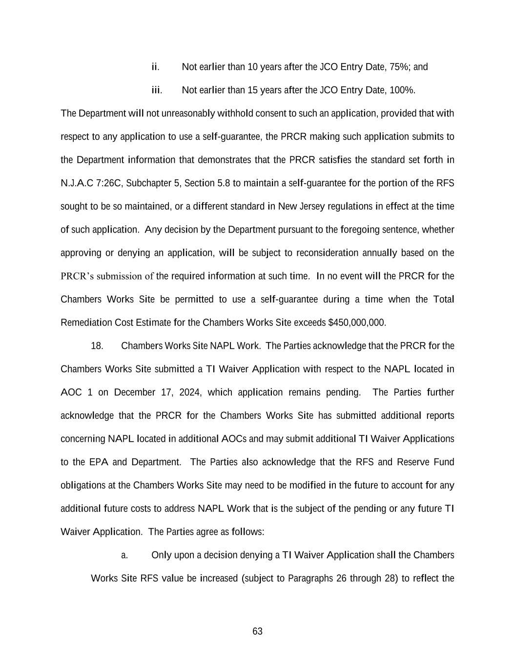 63 ii. Not earlier than 10 years after the JCO Entry Date, 75%; and iii. Not earlier than 15 years after the JCO Entry Date, 100%. The Department will not unreasonably withhold consent to such an application, provided that with respect to any application to use a self-guarantee, the PRCR making such application submits to the Department information that demonstrates that the PRCR satisfies the standard set forth in N.J.A.C 7:26C, Subchapter 5, Section 5.8 to maintain a self-guarantee for the portion of the RFS sought to be so maintained, or a different standard in New Jersey regulations in effect at the time of such application. Any decision by the Department pursuant to the foregoing sentence, whether approving or denying an application, will be subject to reconsideration annually based on the PRCR’s submission of the required information at such time. In no event will the PRCR for the Chambers Works Site be permitted to use a self-guarantee during a time when the Total Remediation Cost Estimate for the Chambers Works Site exceeds $450,000,000. 18. Chambers Works Site NAPL Work. The Parties acknowledge that the PRCR for the Chambers Works Site submitted a TI Waiver Application with respect to the NAPL located in AOC 1 on December 17, 2024, which application remains pending. The Parties further acknowledge that the PRCR for the Chambers Works Site has submitted additional reports concerning NAPL located in additional AOCs and may submit additional TI Waiver Applications to the EPA and Department. The Parties also acknowledge that the RFS and Reserve Fund obligations at the Chambers Works Site may need to be modified in the future to account for any additional future costs to address NAPL Work that is the subject of the pending or any future TI Waiver Application. The Parties agree as follows: a. Only upon a decision denying a TI Waiver Application shall the Chambers Works Site RFS value be increased (subject to Paragraphs 26 through 28) to reflect the