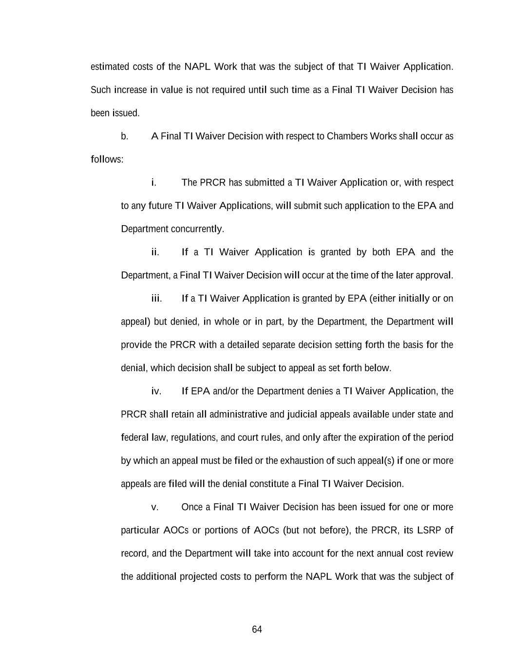64 estimated costs of the NAPL Work that was the subject of that TI Waiver Application. Such increase in value is not required until such time as a Final TI Waiver Decision has been issued. b. A Final TI Waiver Decision with respect to Chambers Works shall occur as follows: i. The PRCR has submitted a TI Waiver Application or, with respect to any future TI Waiver Applications, will submit such application to the EPA and Department concurrently. ii. If a TI Waiver Application is granted by both EPA and the Department, a Final TI Waiver Decision will occur at the time of the later approval. iii. If a TI Waiver Application is granted by EPA (either initially or on appeal) but denied, in whole or in part, by the Department, the Department will provide the PRCR with a detailed separate decision setting forth the basis for the denial, which decision shall be subject to appeal as set forth below. iv. If EPA and/or the Department denies a TI Waiver Application, the PRCR shall retain all administrative and judicial appeals available under state and federal law, regulations, and court rules, and only after the expiration of the period by which an appeal must be filed or the exhaustion of such appeal(s) if one or more appeals are filed will the denial constitute a Final TI Waiver Decision. v. Once a Final TI Waiver Decision has been issued for one or more particular AOCs or portions of AOCs (but not before), the PRCR, its LSRP of record, and the Department will take into account for the next annual cost review the additional projected costs to perform the NAPL Work that was the subject of