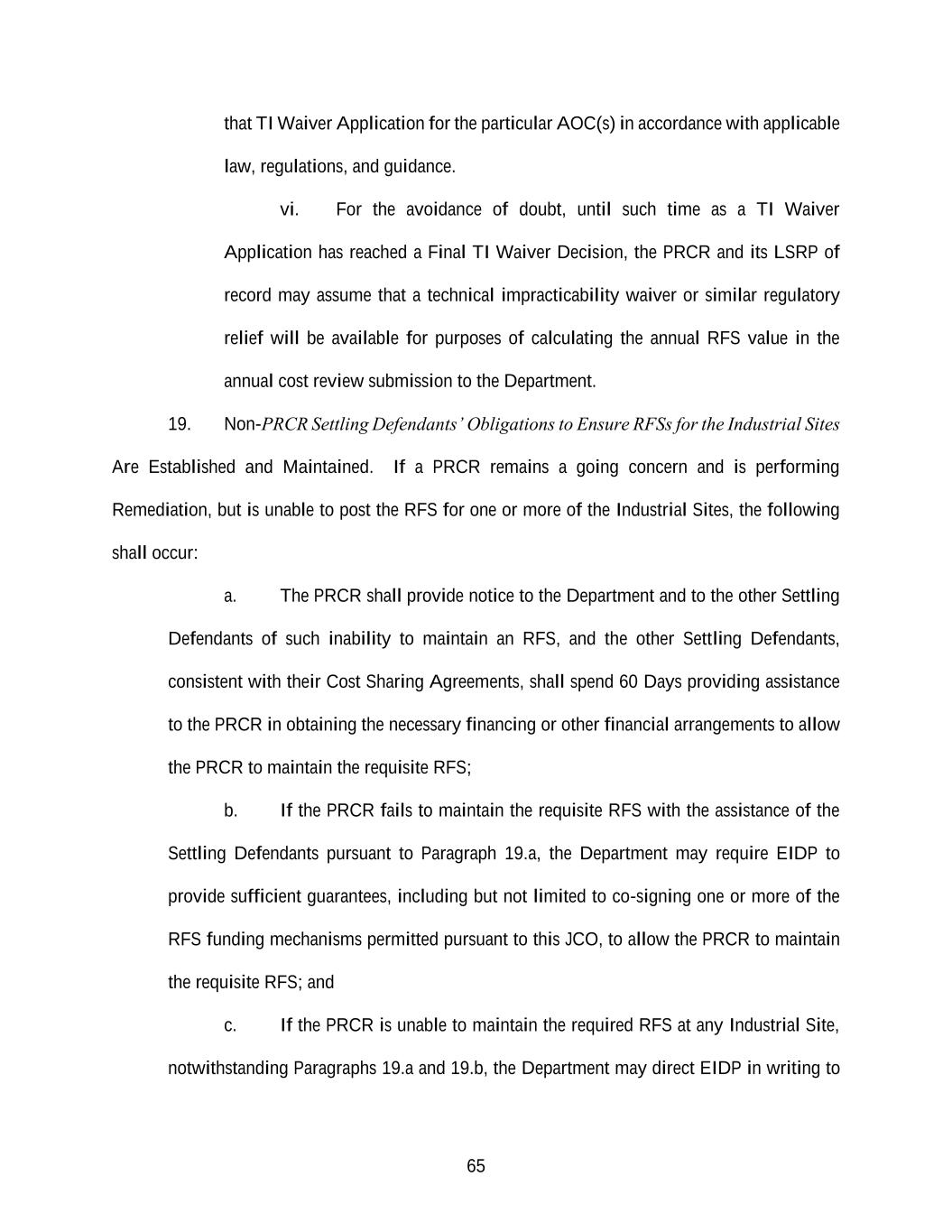65 that TI Waiver Application for the particular AOC(s) in accordance with applicable law, regulations, and guidance. vi. For the avoidance of doubt, until such time as a TI Waiver Application has reached a Final TI Waiver Decision, the PRCR and its LSRP of record may assume that a technical impracticability waiver or similar regulatory relief will be available for purposes of calculating the annual RFS value in the annual cost review submission to the Department. 19. Non-PRCR Settling Defendants’ Obligations to Ensure RFSs for the Industrial Sites Are Established and Maintained. If a PRCR remains a going concern and is performing Remediation, but is unable to post the RFS for one or more of the Industrial Sites, the following shall occur: a. The PRCR shall provide notice to the Department and to the other Settling Defendants of such inability to maintain an RFS, and the other Settling Defendants, consistent with their Cost Sharing Agreements, shall spend 60 Days providing assistance to the PRCR in obtaining the necessary financing or other financial arrangements to allow the PRCR to maintain the requisite RFS; b. If the PRCR fails to maintain the requisite RFS with the assistance of the Settling Defendants pursuant to Paragraph 19.a, the Department may require EIDP to provide sufficient guarantees, including but not limited to co-signing one or more of the RFS funding mechanisms permitted pursuant to this JCO, to allow the PRCR to maintain the requisite RFS; and c. If the PRCR is unable to maintain the required RFS at any Industrial Site, notwithstanding Paragraphs 19.a and 19.b, the Department may direct EIDP in writing to