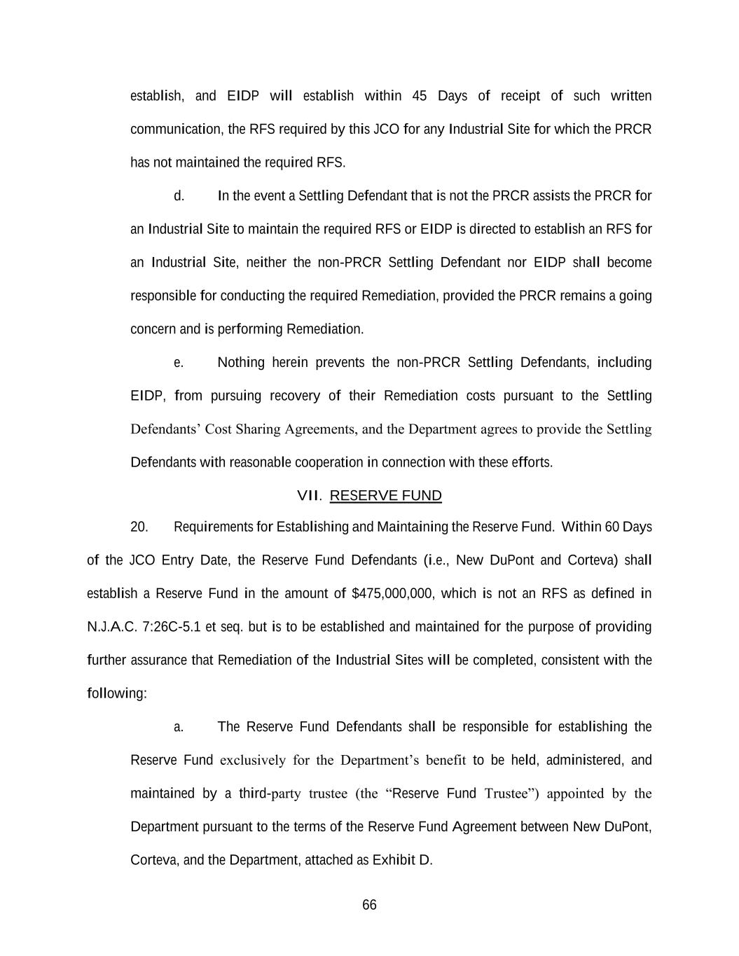 66 establish, and EIDP will establish within 45 Days of receipt of such written communication, the RFS required by this JCO for any Industrial Site for which the PRCR has not maintained the required RFS. d. In the event a Settling Defendant that is not the PRCR assists the PRCR for an Industrial Site to maintain the required RFS or EIDP is directed to establish an RFS for an Industrial Site, neither the non-PRCR Settling Defendant nor EIDP shall become responsible for conducting the required Remediation, provided the PRCR remains a going concern and is performing Remediation. e. Nothing herein prevents the non-PRCR Settling Defendants, including EIDP, from pursuing recovery of their Remediation costs pursuant to the Settling Defendants’ Cost Sharing Agreements, and the Department agrees to provide the Settling Defendants with reasonable cooperation in connection with these efforts. VII. RESERVE FUND 20. Requirements for Establishing and Maintaining the Reserve Fund. Within 60 Days of the JCO Entry Date, the Reserve Fund Defendants (i.e., New DuPont and Corteva) shall establish a Reserve Fund in the amount of $475,000,000, which is not an RFS as defined in N.J.A.C. 7:26C-5.1 et seq. but is to be established and maintained for the purpose of providing further assurance that Remediation of the Industrial Sites will be completed, consistent with the following: a. The Reserve Fund Defendants shall be responsible for establishing the Reserve Fund exclusively for the Department’s benefit to be held, administered, and maintained by a third-party trustee (the “Reserve Fund Trustee”) appointed by the Department pursuant to the terms of the Reserve Fund Agreement between New DuPont, Corteva, and the Department, attached as Exhibit D.