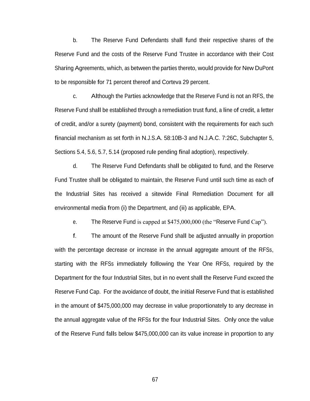 67 b. The Reserve Fund Defendants shall fund their respective shares of the Reserve Fund and the costs of the Reserve Fund Trustee in accordance with their Cost Sharing Agreements, which, as between the parties thereto, would provide for New DuPont to be responsible for 71 percent thereof and Corteva 29 percent. c. Although the Parties acknowledge that the Reserve Fund is not an RFS, the Reserve Fund shall be established through a remediation trust fund, a line of credit, a letter of credit, and/or a surety (payment) bond, consistent with the requirements for each such financial mechanism as set forth in N.J.S.A. 58:10B-3 and N.J.A.C. 7:26C, Subchapter 5, Sections 5.4, 5.6, 5.7, 5.14 (proposed rule pending final adoption), respectively. d. The Reserve Fund Defendants shall be obligated to fund, and the Reserve Fund Trustee shall be obligated to maintain, the Reserve Fund until such time as each of the Industrial Sites has received a sitewide Final Remediation Document for all environmental media from (i) the Department, and (ii) as applicable, EPA. e. The Reserve Fund is capped at $475,000,000 (the “Reserve Fund Cap”). f. The amount of the Reserve Fund shall be adjusted annually in proportion with the percentage decrease or increase in the annual aggregate amount of the RFSs, starting with the RFSs immediately following the Year One RFSs, required by the Department for the four Industrial Sites, but in no event shall the Reserve Fund exceed the Reserve Fund Cap. For the avoidance of doubt, the initial Reserve Fund that is established in the amount of $475,000,000 may decrease in value proportionately to any decrease in the annual aggregate value of the RFSs for the four Industrial Sites. Only once the value of the Reserve Fund falls below $475,000,000 can its value increase in proportion to any