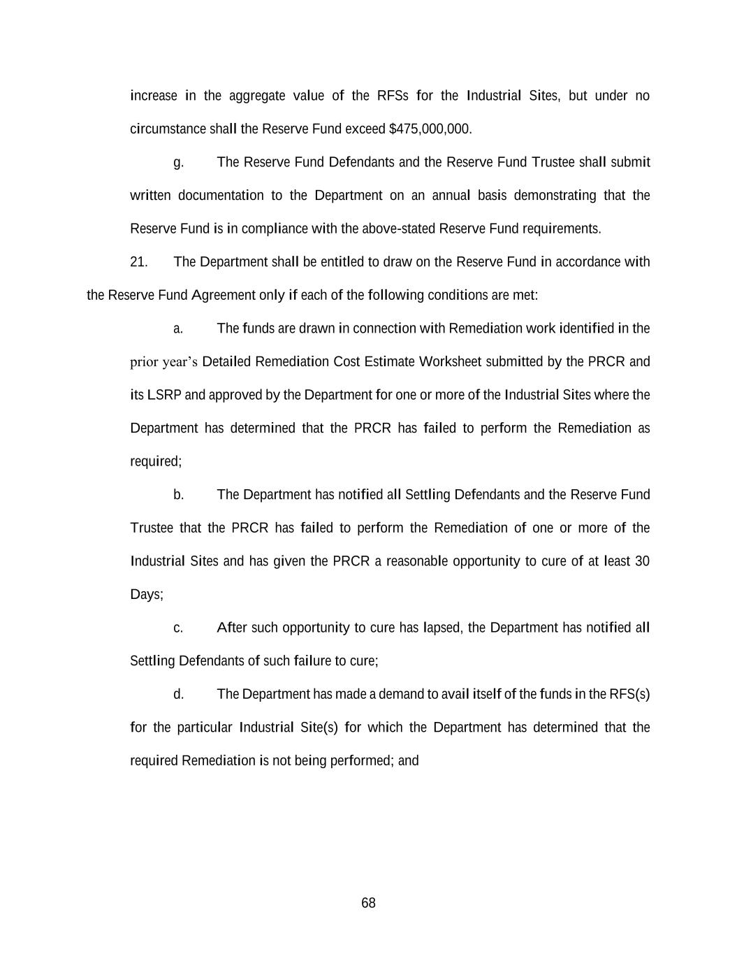 68 increase in the aggregate value of the RFSs for the Industrial Sites, but under no circumstance shall the Reserve Fund exceed $475,000,000. g. The Reserve Fund Defendants and the Reserve Fund Trustee shall submit written documentation to the Department on an annual basis demonstrating that the Reserve Fund is in compliance with the above-stated Reserve Fund requirements. 21. The Department shall be entitled to draw on the Reserve Fund in accordance with the Reserve Fund Agreement only if each of the following conditions are met: a. The funds are drawn in connection with Remediation work identified in the prior year’s Detailed Remediation Cost Estimate Worksheet submitted by the PRCR and its LSRP and approved by the Department for one or more of the Industrial Sites where the Department has determined that the PRCR has failed to perform the Remediation as required; b. The Department has notified all Settling Defendants and the Reserve Fund Trustee that the PRCR has failed to perform the Remediation of one or more of the Industrial Sites and has given the PRCR a reasonable opportunity to cure of at least 30 Days; c. After such opportunity to cure has lapsed, the Department has notified all Settling Defendants of such failure to cure; d. The Department has made a demand to avail itself of the funds in the RFS(s) for the particular Industrial Site(s) for which the Department has determined that the required Remediation is not being performed; and