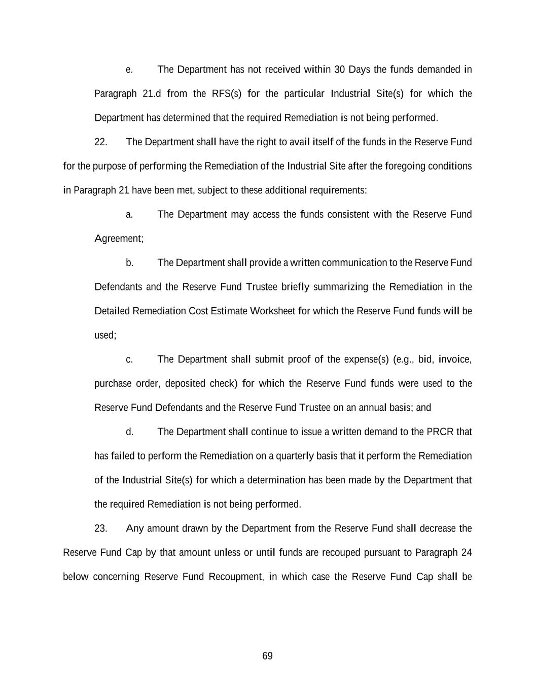 69 e. The Department has not received within 30 Days the funds demanded in Paragraph 21.d from the RFS(s) for the particular Industrial Site(s) for which the Department has determined that the required Remediation is not being performed. 22. The Department shall have the right to avail itself of the funds in the Reserve Fund for the purpose of performing the Remediation of the Industrial Site after the foregoing conditions in Paragraph 21 have been met, subject to these additional requirements: a. The Department may access the funds consistent with the Reserve Fund Agreement; b. The Department shall provide a written communication to the Reserve Fund Defendants and the Reserve Fund Trustee briefly summarizing the Remediation in the Detailed Remediation Cost Estimate Worksheet for which the Reserve Fund funds will be used; c. The Department shall submit proof of the expense(s) (e.g., bid, invoice, purchase order, deposited check) for which the Reserve Fund funds were used to the Reserve Fund Defendants and the Reserve Fund Trustee on an annual basis; and d. The Department shall continue to issue a written demand to the PRCR that has failed to perform the Remediation on a quarterly basis that it perform the Remediation of the Industrial Site(s) for which a determination has been made by the Department that the required Remediation is not being performed. 23. Any amount drawn by the Department from the Reserve Fund shall decrease the Reserve Fund Cap by that amount unless or until funds are recouped pursuant to Paragraph 24 below concerning Reserve Fund Recoupment, in which case the Reserve Fund Cap shall be