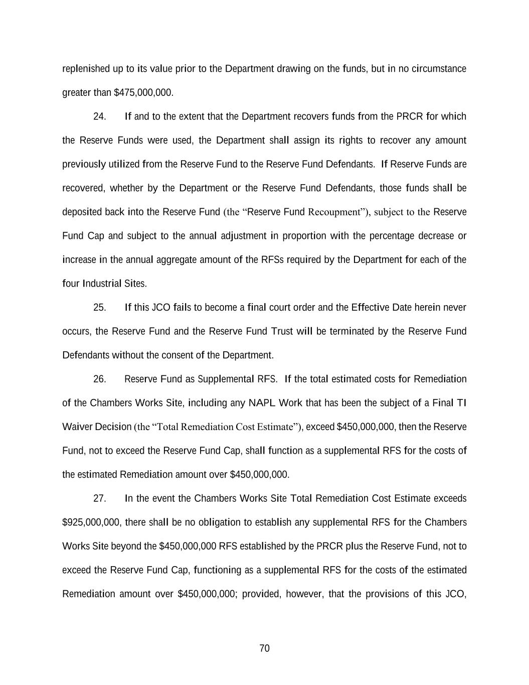70 replenished up to its value prior to the Department drawing on the funds, but in no circumstance greater than $475,000,000. 24. If and to the extent that the Department recovers funds from the PRCR for which the Reserve Funds were used, the Department shall assign its rights to recover any amount previously utilized from the Reserve Fund to the Reserve Fund Defendants. If Reserve Funds are recovered, whether by the Department or the Reserve Fund Defendants, those funds shall be deposited back into the Reserve Fund (the “Reserve Fund Recoupment”), subject to the Reserve Fund Cap and subject to the annual adjustment in proportion with the percentage decrease or increase in the annual aggregate amount of the RFSs required by the Department for each of the four Industrial Sites. 25. If this JCO fails to become a final court order and the Effective Date herein never occurs, the Reserve Fund and the Reserve Fund Trust will be terminated by the Reserve Fund Defendants without the consent of the Department. 26. Reserve Fund as Supplemental RFS. If the total estimated costs for Remediation of the Chambers Works Site, including any NAPL Work that has been the subject of a Final TI Waiver Decision (the “Total Remediation Cost Estimate”), exceed $450,000,000, then the Reserve Fund, not to exceed the Reserve Fund Cap, shall function as a supplemental RFS for the costs of the estimated Remediation amount over $450,000,000. 27. In the event the Chambers Works Site Total Remediation Cost Estimate exceeds $925,000,000, there shall be no obligation to establish any supplemental RFS for the Chambers Works Site beyond the $450,000,000 RFS established by the PRCR plus the Reserve Fund, not to exceed the Reserve Fund Cap, functioning as a supplemental RFS for the costs of the estimated Remediation amount over $450,000,000; provided, however, that the provisions of this JCO,
