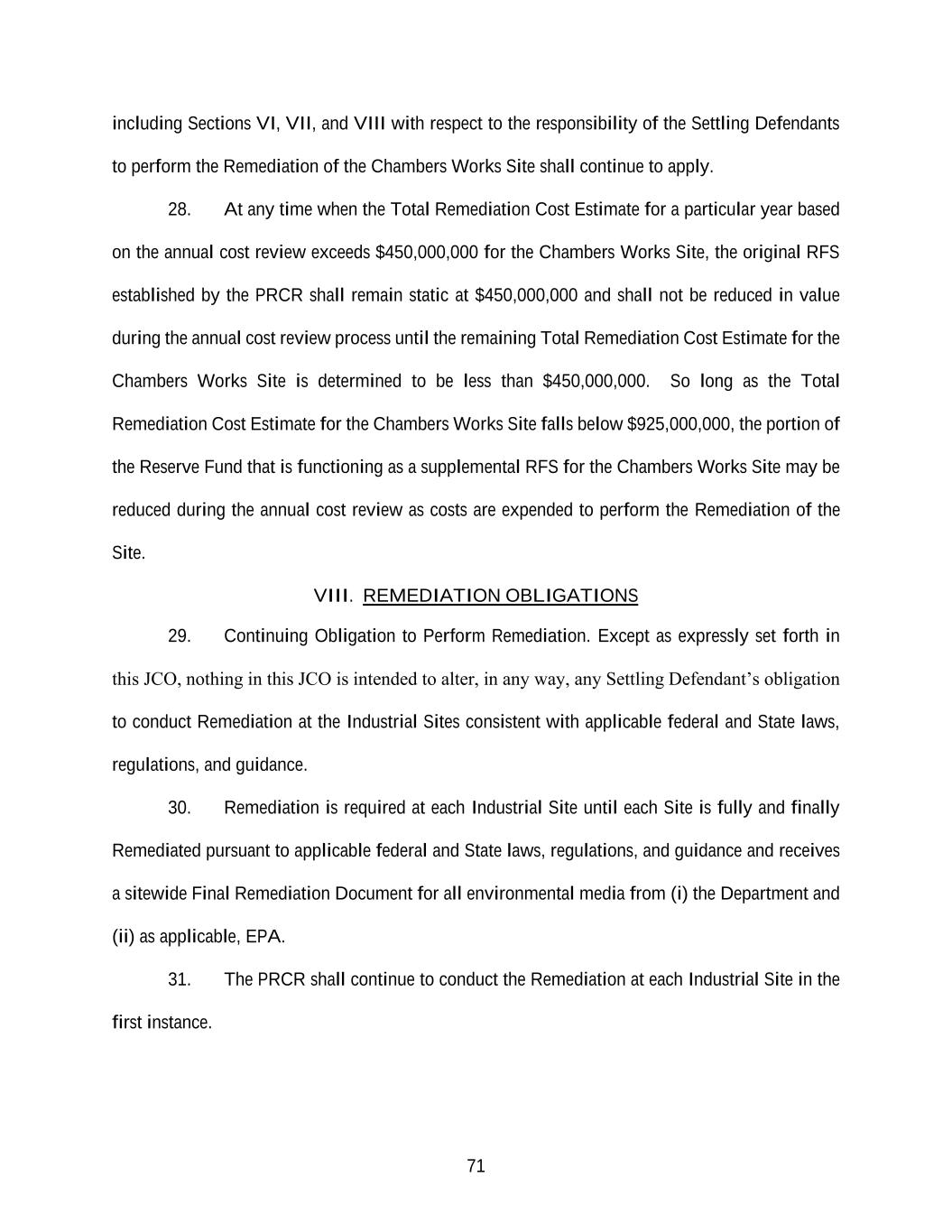 71 including Sections VI, VII, and VIII with respect to the responsibility of the Settling Defendants to perform the Remediation of the Chambers Works Site shall continue to apply. 28. At any time when the Total Remediation Cost Estimate for a particular year based on the annual cost review exceeds $450,000,000 for the Chambers Works Site, the original RFS established by the PRCR shall remain static at $450,000,000 and shall not be reduced in value during the annual cost review process until the remaining Total Remediation Cost Estimate for the Chambers Works Site is determined to be less than $450,000,000. So long as the Total Remediation Cost Estimate for the Chambers Works Site falls below $925,000,000, the portion of the Reserve Fund that is functioning as a supplemental RFS for the Chambers Works Site may be reduced during the annual cost review as costs are expended to perform the Remediation of the Site. VIII. REMEDIATION OBLIGATIONS 29. Continuing Obligation to Perform Remediation. Except as expressly set forth in this JCO, nothing in this JCO is intended to alter, in any way, any Settling Defendant’s obligation to conduct Remediation at the Industrial Sites consistent with applicable federal and State laws, regulations, and guidance. 30. Remediation is required at each Industrial Site until each Site is fully and finally Remediated pursuant to applicable federal and State laws, regulations, and guidance and receives a sitewide Final Remediation Document for all environmental media from (i) the Department and (ii) as applicable, EPA. 31. The PRCR shall continue to conduct the Remediation at each Industrial Site in the first instance.