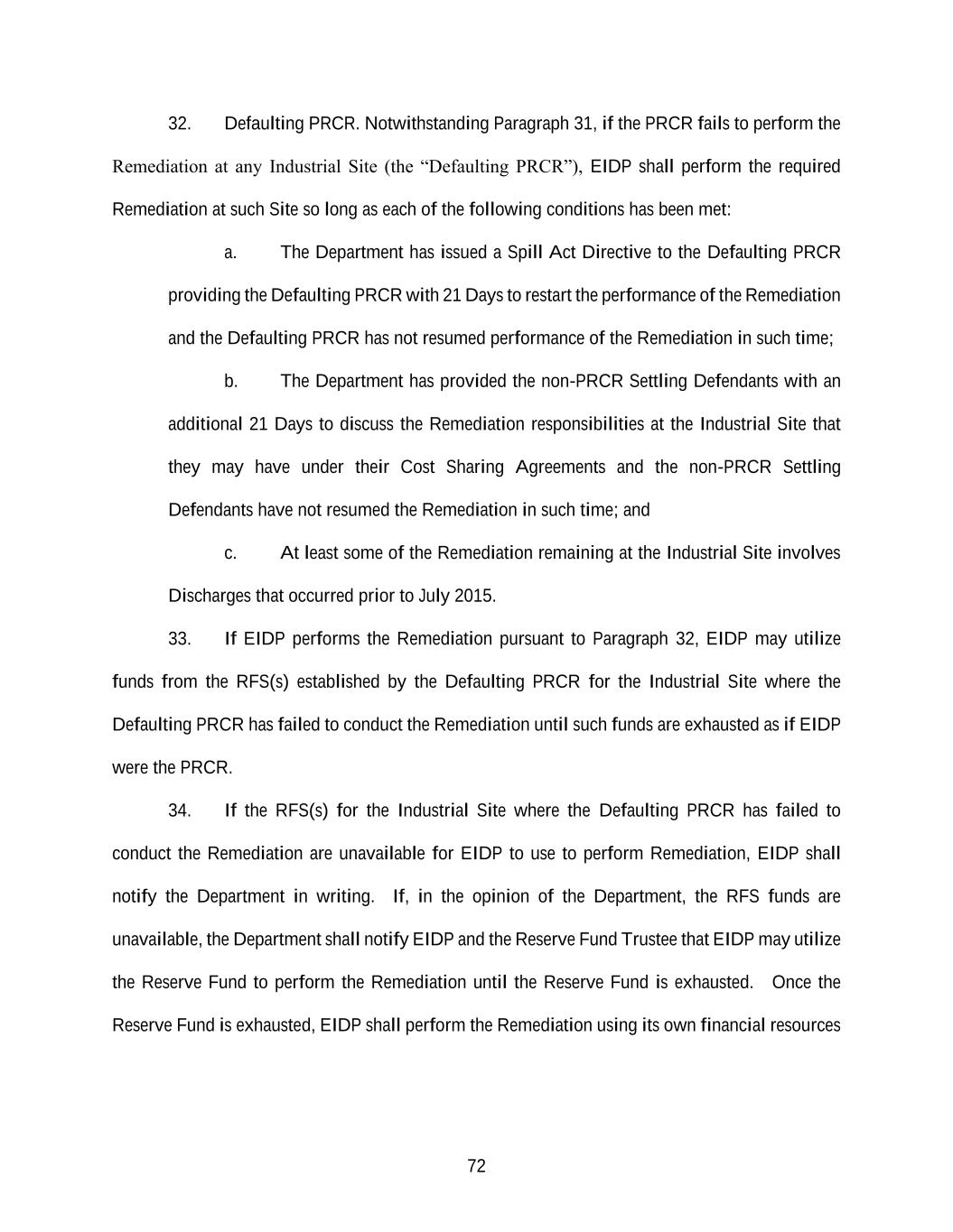 72 32. Defaulting PRCR. Notwithstanding Paragraph 31, if the PRCR fails to perform the Remediation at any Industrial Site (the “Defaulting PRCR”), EIDP shall perform the required Remediation at such Site so long as each of the following conditions has been met: a. The Department has issued a Spill Act Directive to the Defaulting PRCR providing the Defaulting PRCR with 21 Days to restart the performance of the Remediation and the Defaulting PRCR has not resumed performance of the Remediation in such time; b. The Department has provided the non-PRCR Settling Defendants with an additional 21 Days to discuss the Remediation responsibilities at the Industrial Site that they may have under their Cost Sharing Agreements and the non-PRCR Settling Defendants have not resumed the Remediation in such time; and c. At least some of the Remediation remaining at the Industrial Site involves Discharges that occurred prior to July 2015. 33. If EIDP performs the Remediation pursuant to Paragraph 32, EIDP may utilize funds from the RFS(s) established by the Defaulting PRCR for the Industrial Site where the Defaulting PRCR has failed to conduct the Remediation until such funds are exhausted as if EIDP were the PRCR. 34. If the RFS(s) for the Industrial Site where the Defaulting PRCR has failed to conduct the Remediation are unavailable for EIDP to use to perform Remediation, EIDP shall notify the Department in writing. If, in the opinion of the Department, the RFS funds are unavailable, the Department shall notify EIDP and the Reserve Fund Trustee that EIDP may utilize the Reserve Fund to perform the Remediation until the Reserve Fund is exhausted. Once the Reserve Fund is exhausted, EIDP shall perform the Remediation using its own financial resources