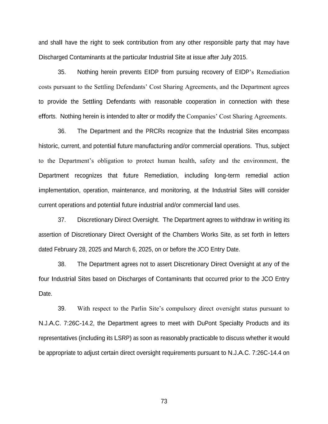 73 and shall have the right to seek contribution from any other responsible party that may have Discharged Contaminants at the particular Industrial Site at issue after July 2015. 35. Nothing herein prevents EIDP from pursuing recovery of EIDP’s Remediation costs pursuant to the Settling Defendants’ Cost Sharing Agreements, and the Department agrees to provide the Settling Defendants with reasonable cooperation in connection with these efforts. Nothing herein is intended to alter or modify the Companies’ Cost Sharing Agreements. 36. The Department and the PRCRs recognize that the Industrial Sites encompass historic, current, and potential future manufacturing and/or commercial operations. Thus, subject to the Department’s obligation to protect human health, safety and the environment, the Department recognizes that future Remediation, including long-term remedial action implementation, operation, maintenance, and monitoring, at the Industrial Sites will consider current operations and potential future industrial and/or commercial land uses. 37. Discretionary Direct Oversight. The Department agrees to withdraw in writing its assertion of Discretionary Direct Oversight of the Chambers Works Site, as set forth in letters dated February 28, 2025 and March 6, 2025, on or before the JCO Entry Date. 38. The Department agrees not to assert Discretionary Direct Oversight at any of the four Industrial Sites based on Discharges of Contaminants that occurred prior to the JCO Entry Date. 39. With respect to the Parlin Site’s compulsory direct oversight status pursuant to N.J.A.C. 7:26C-14.2, the Department agrees to meet with DuPont Specialty Products and its representatives (including its LSRP) as soon as reasonably practicable to discuss whether it would be appropriate to adjust certain direct oversight requirements pursuant to N.J.A.C. 7:26C-14.4 on