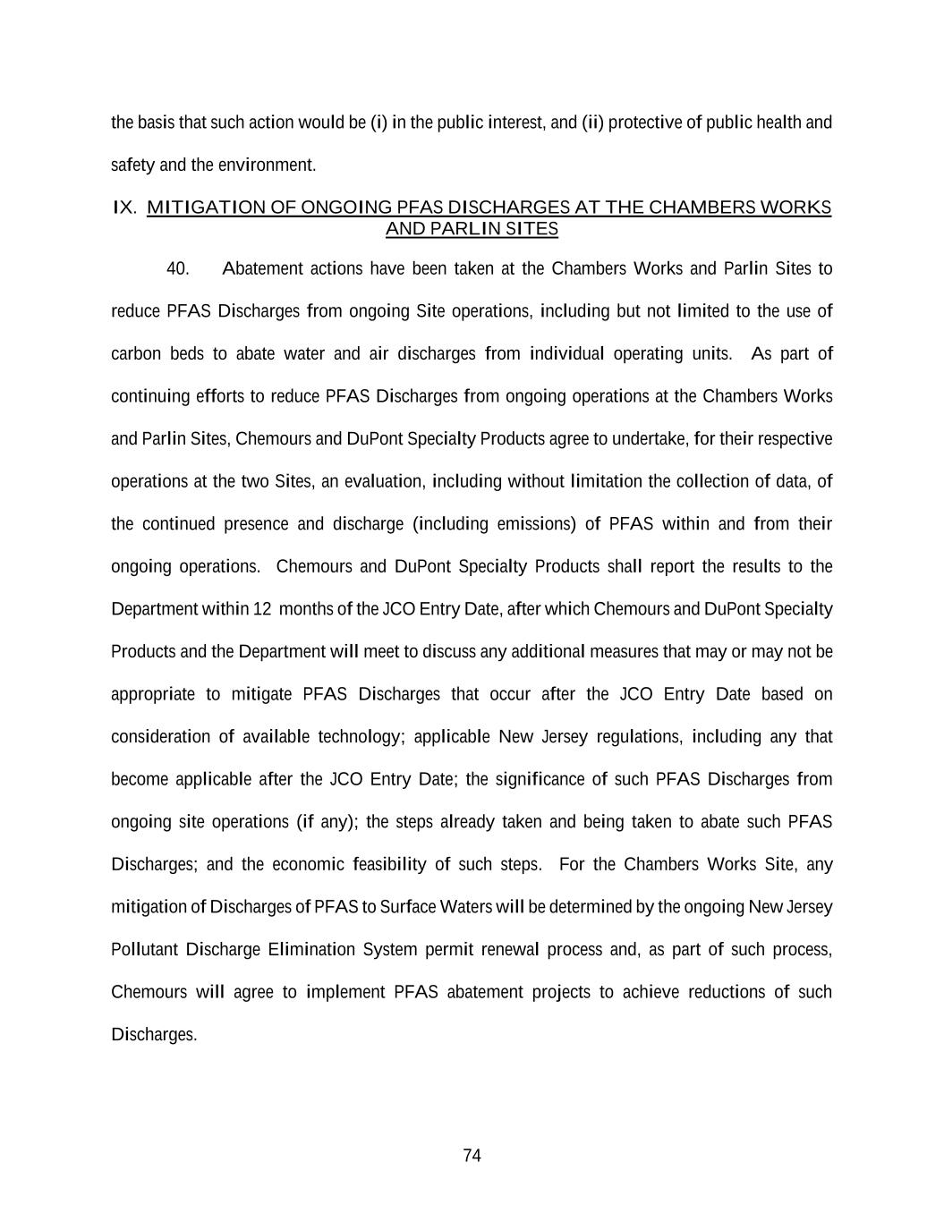 74 the basis that such action would be (i) in the public interest, and (ii) protective of public health and safety and the environment. IX. MITIGATION OF ONGOING PFAS DISCHARGES AT THE CHAMBERS WORKS AND PARLIN SITES 40. Abatement actions have been taken at the Chambers Works and Parlin Sites to reduce PFAS Discharges from ongoing Site operations, including but not limited to the use of carbon beds to abate water and air discharges from individual operating units. As part of continuing efforts to reduce PFAS Discharges from ongoing operations at the Chambers Works and Parlin Sites, Chemours and DuPont Specialty Products agree to undertake, for their respective operations at the two Sites, an evaluation, including without limitation the collection of data, of the continued presence and discharge (including emissions) of PFAS within and from their ongoing operations. Chemours and DuPont Specialty Products shall report the results to the Department within 12 months of the JCO Entry Date, after which Chemours and DuPont Specialty Products and the Department will meet to discuss any additional measures that may or may not be appropriate to mitigate PFAS Discharges that occur after the JCO Entry Date based on consideration of available technology; applicable New Jersey regulations, including any that become applicable after the JCO Entry Date; the significance of such PFAS Discharges from ongoing site operations (if any); the steps already taken and being taken to abate such PFAS Discharges; and the economic feasibility of such steps. For the Chambers Works Site, any mitigation of Discharges of PFAS to Surface Waters will be determined by the ongoing New Jersey Pollutant Discharge Elimination System permit renewal process and, as part of such process, Chemours will agree to implement PFAS abatement projects to achieve reductions of such Discharges.