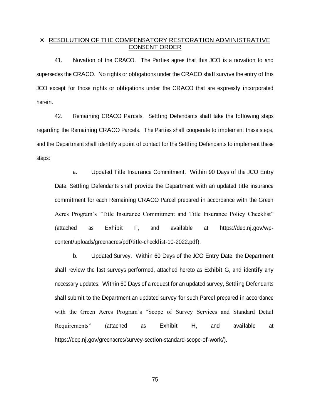 75 X. RESOLUTION OF THE COMPENSATORY RESTORATION ADMINISTRATIVE CONSENT ORDER 41. Novation of the CRACO. The Parties agree that this JCO is a novation to and supersedes the CRACO. No rights or obligations under the CRACO shall survive the entry of this JCO except for those rights or obligations under the CRACO that are expressly incorporated herein. 42. Remaining CRACO Parcels. Settling Defendants shall take the following steps regarding the Remaining CRACO Parcels. The Parties shall cooperate to implement these steps, and the Department shall identify a point of contact for the Settling Defendants to implement these steps: a. Updated Title Insurance Commitment. Within 90 Days of the JCO Entry Date, Settling Defendants shall provide the Department with an updated title insurance commitment for each Remaining CRACO Parcel prepared in accordance with the Green Acres Program’s “Title Insurance Commitment and Title Insurance Policy Checklist” (attached as Exhibit F, and available at https://dep.nj.gov/wp- content/uploads/greenacres/pdf/title-checklist-10-2022.pdf). b. Updated Survey. Within 60 Days of the JCO Entry Date, the Department shall review the last surveys performed, attached hereto as Exhibit G, and identify any necessary updates. Within 60 Days of a request for an updated survey, Settling Defendants shall submit to the Department an updated survey for such Parcel prepared in accordance with the Green Acres Program’s “Scope of Survey Services and Standard Detail Requirements” (attached as Exhibit H, and available at https://dep.nj.gov/greenacres/survey-section-standard-scope-of-work/).