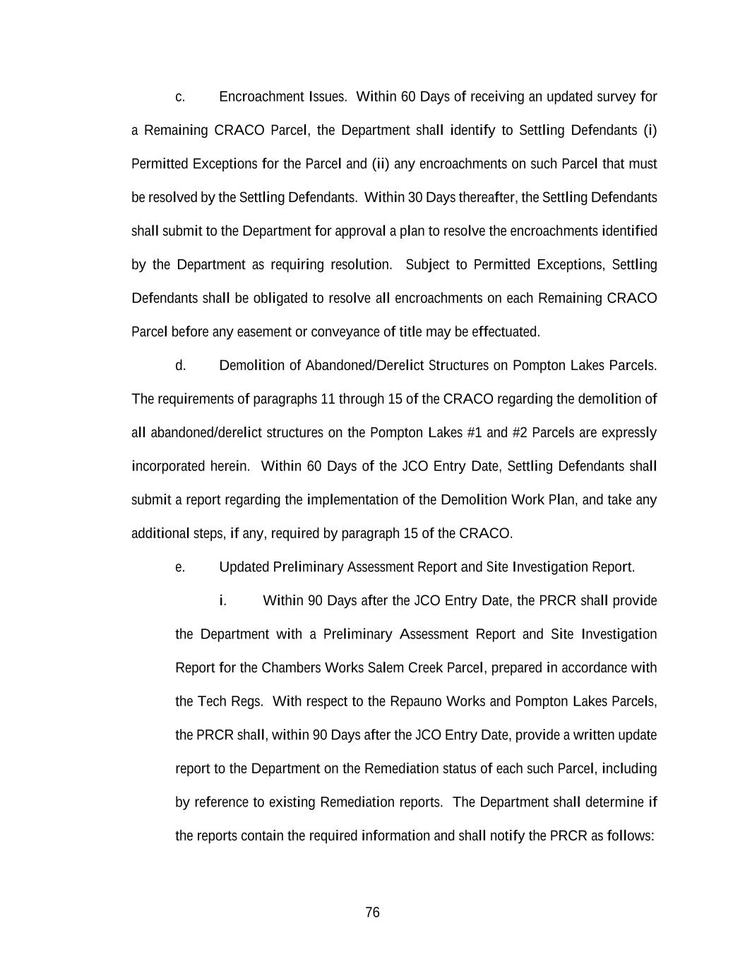 76 c. Encroachment Issues. Within 60 Days of receiving an updated survey for a Remaining CRACO Parcel, the Department shall identify to Settling Defendants (i) Permitted Exceptions for the Parcel and (ii) any encroachments on such Parcel that must be resolved by the Settling Defendants. Within 30 Days thereafter, the Settling Defendants shall submit to the Department for approval a plan to resolve the encroachments identified by the Department as requiring resolution. Subject to Permitted Exceptions, Settling Defendants shall be obligated to resolve all encroachments on each Remaining CRACO Parcel before any easement or conveyance of title may be effectuated. d. Demolition of Abandoned/Derelict Structures on Pompton Lakes Parcels. The requirements of paragraphs 11 through 15 of the CRACO regarding the demolition of all abandoned/derelict structures on the Pompton Lakes #1 and #2 Parcels are expressly incorporated herein. Within 60 Days of the JCO Entry Date, Settling Defendants shall submit a report regarding the implementation of the Demolition Work Plan, and take any additional steps, if any, required by paragraph 15 of the CRACO. e. Updated Preliminary Assessment Report and Site Investigation Report. i. Within 90 Days after the JCO Entry Date, the PRCR shall provide the Department with a Preliminary Assessment Report and Site Investigation Report for the Chambers Works Salem Creek Parcel, prepared in accordance with the Tech Regs. With respect to the Repauno Works and Pompton Lakes Parcels, the PRCR shall, within 90 Days after the JCO Entry Date, provide a written update report to the Department on the Remediation status of each such Parcel, including by reference to existing Remediation reports. The Department shall determine if the reports contain the required information and shall notify the PRCR as follows: