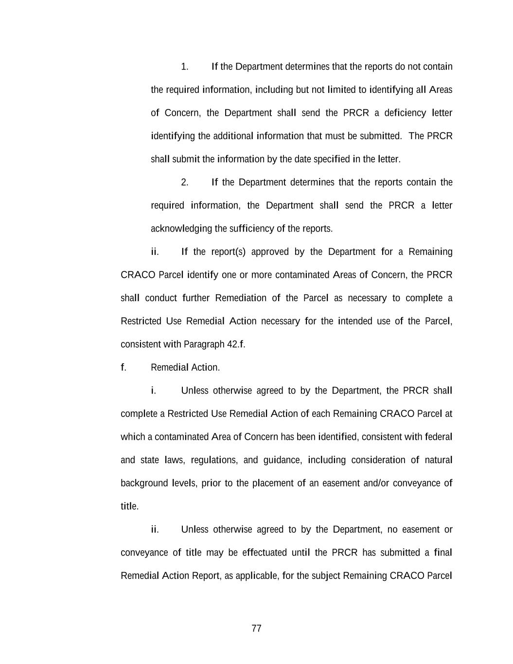 77 1. If the Department determines that the reports do not contain the required information, including but not limited to identifying all Areas of Concern, the Department shall send the PRCR a deficiency letter identifying the additional information that must be submitted. The PRCR shall submit the information by the date specified in the letter. 2. If the Department determines that the reports contain the required information, the Department shall send the PRCR a letter acknowledging the sufficiency of the reports. ii. If the report(s) approved by the Department for a Remaining CRACO Parcel identify one or more contaminated Areas of Concern, the PRCR shall conduct further Remediation of the Parcel as necessary to complete a Restricted Use Remedial Action necessary for the intended use of the Parcel, consistent with Paragraph 42.f. f. Remedial Action. i. Unless otherwise agreed to by the Department, the PRCR shall complete a Restricted Use Remedial Action of each Remaining CRACO Parcel at which a contaminated Area of Concern has been identified, consistent with federal and state laws, regulations, and guidance, including consideration of natural background levels, prior to the placement of an easement and/or conveyance of title. ii. Unless otherwise agreed to by the Department, no easement or conveyance of title may be effectuated until the PRCR has submitted a final Remedial Action Report, as applicable, for the subject Remaining CRACO Parcel