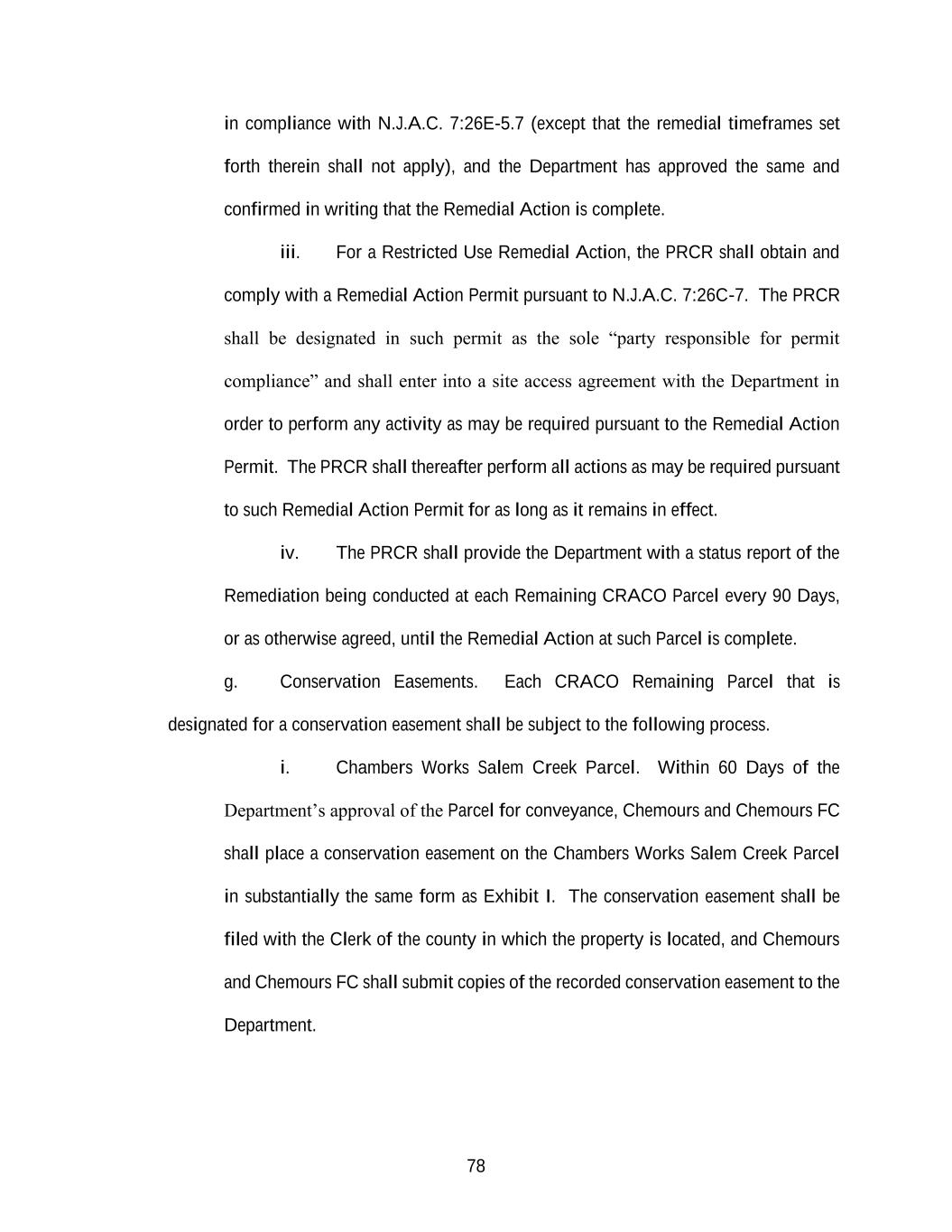 78 in compliance with N.J.A.C. 7:26E-5.7 (except that the remedial timeframes set forth therein shall not apply), and the Department has approved the same and confirmed in writing that the Remedial Action is complete. iii. For a Restricted Use Remedial Action, the PRCR shall obtain and comply with a Remedial Action Permit pursuant to N.J.A.C. 7:26C-7. The PRCR shall be designated in such permit as the sole “party responsible for permit compliance” and shall enter into a site access agreement with the Department in order to perform any activity as may be required pursuant to the Remedial Action Permit. The PRCR shall thereafter perform all actions as may be required pursuant to such Remedial Action Permit for as long as it remains in effect. iv. The PRCR shall provide the Department with a status report of the Remediation being conducted at each Remaining CRACO Parcel every 90 Days, or as otherwise agreed, until the Remedial Action at such Parcel is complete. g. Conservation Easements. Each CRACO Remaining Parcel that is designated for a conservation easement shall be subject to the following process. i. Chambers Works Salem Creek Parcel. Within 60 Days of the Department’s approval of the Parcel for conveyance, Chemours and Chemours FC shall place a conservation easement on the Chambers Works Salem Creek Parcel in substantially the same form as Exhibit I. The conservation easement shall be filed with the Clerk of the county in which the property is located, and Chemours and Chemours FC shall submit copies of the recorded conservation easement to the Department.