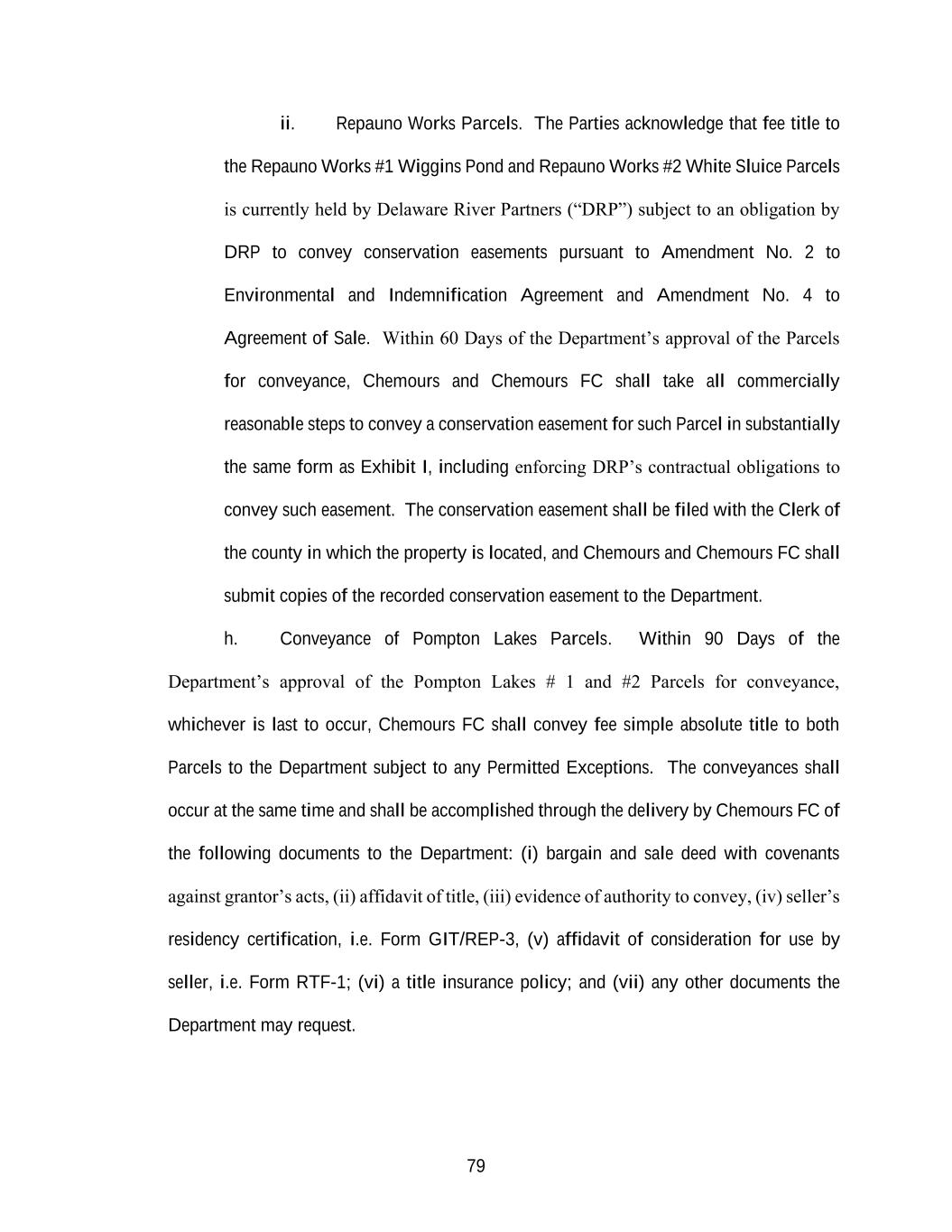 79 ii. Repauno Works Parcels. The Parties acknowledge that fee title to the Repauno Works #1 Wiggins Pond and Repauno Works #2 White Sluice Parcels is currently held by Delaware River Partners (“DRP”) subject to an obligation by DRP to convey conservation easements pursuant to Amendment No. 2 to Environmental and Indemnification Agreement and Amendment No. 4 to Agreement of Sale. Within 60 Days of the Department’s approval of the Parcels for conveyance, Chemours and Chemours FC shall take all commercially reasonable steps to convey a conservation easement for such Parcel in substantially the same form as Exhibit I, including enforcing DRP’s contractual obligations to convey such easement. The conservation easement shall be filed with the Clerk of the county in which the property is located, and Chemours and Chemours FC shall submit copies of the recorded conservation easement to the Department. h. Conveyance of Pompton Lakes Parcels. Within 90 Days of the Department’s approval of the Pompton Lakes # 1 and #2 Parcels for conveyance, whichever is last to occur, Chemours FC shall convey fee simple absolute title to both Parcels to the Department subject to any Permitted Exceptions. The conveyances shall occur at the same time and shall be accomplished through the delivery by Chemours FC of the following documents to the Department: (i) bargain and sale deed with covenants against grantor’s acts, (ii) affidavit of title, (iii) evidence of authority to convey, (iv) seller’s residency certification, i.e. Form GIT/REP-3, (v) affidavit of consideration for use by seller, i.e. Form RTF-1; (vi) a title insurance policy; and (vii) any other documents the Department may request.