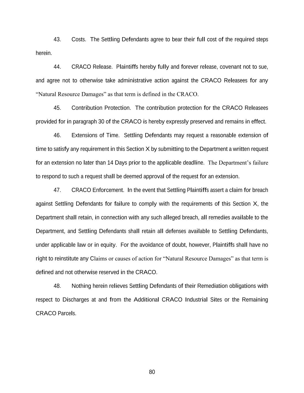80 43. Costs. The Settling Defendants agree to bear their full cost of the required steps herein. 44. CRACO Release. Plaintiffs hereby fully and forever release, covenant not to sue, and agree not to otherwise take administrative action against the CRACO Releasees for any “Natural Resource Damages” as that term is defined in the CRACO. 45. Contribution Protection. The contribution protection for the CRACO Releasees provided for in paragraph 30 of the CRACO is hereby expressly preserved and remains in effect. 46. Extensions of Time. Settling Defendants may request a reasonable extension of time to satisfy any requirement in this Section X by submitting to the Department a written request for an extension no later than 14 Days prior to the applicable deadline. The Department’s failure to respond to such a request shall be deemed approval of the request for an extension. 47. CRACO Enforcement. In the event that Settling Plaintiffs assert a claim for breach against Settling Defendants for failure to comply with the requirements of this Section X, the Department shall retain, in connection with any such alleged breach, all remedies available to the Department, and Settling Defendants shall retain all defenses available to Settling Defendants, under applicable law or in equity. For the avoidance of doubt, however, Plaintiffs shall have no right to reinstitute any Claims or causes of action for “Natural Resource Damages” as that term is defined and not otherwise reserved in the CRACO. 48. Nothing herein relieves Settling Defendants of their Remediation obligations with respect to Discharges at and from the Additional CRACO Industrial Sites or the Remaining CRACO Parcels.