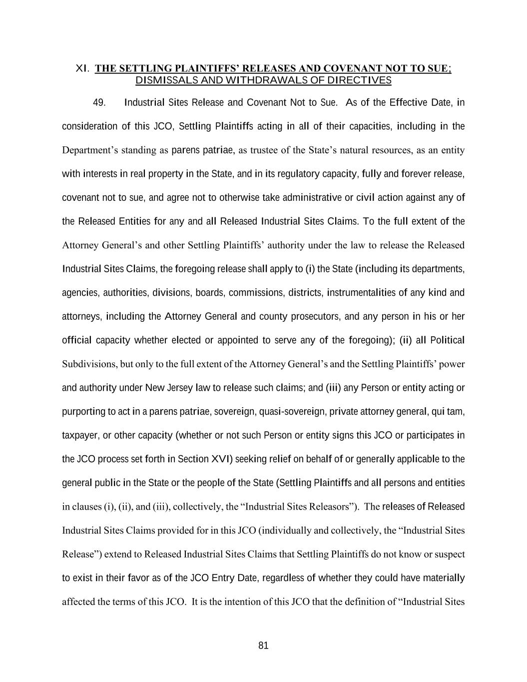 81 XI. THE SETTLING PLAINTIFFS’ RELEASES AND COVENANT NOT TO SUE; DISMISSALS AND WITHDRAWALS OF DIRECTIVES 49. Industrial Sites Release and Covenant Not to Sue. As of the Effective Date, in consideration of this JCO, Settling Plaintiffs acting in all of their capacities, including in the Department’s standing as parens patriae, as trustee of the State’s natural resources, as an entity with interests in real property in the State, and in its regulatory capacity, fully and forever release, covenant not to sue, and agree not to otherwise take administrative or civil action against any of the Released Entities for any and all Released Industrial Sites Claims. To the full extent of the Attorney General’s and other Settling Plaintiffs’ authority under the law to release the Released Industrial Sites Claims, the foregoing release shall apply to (i) the State (including its departments, agencies, authorities, divisions, boards, commissions, districts, instrumentalities of any kind and attorneys, including the Attorney General and county prosecutors, and any person in his or her official capacity whether elected or appointed to serve any of the foregoing); (ii) all Political Subdivisions, but only to the full extent of the Attorney General’s and the Settling Plaintiffs’ power and authority under New Jersey law to release such claims; and (iii) any Person or entity acting or purporting to act in a parens patriae, sovereign, quasi-sovereign, private attorney general, qui tam, taxpayer, or other capacity (whether or not such Person or entity signs this JCO or participates in the JCO process set forth in Section XVI) seeking relief on behalf of or generally applicable to the general public in the State or the people of the State (Settling Plaintiffs and all persons and entities in clauses (i), (ii), and (iii), collectively, the “Industrial Sites Releasors”). The releases of Released Industrial Sites Claims provided for in this JCO (individually and collectively, the “Industrial Sites Release”) extend to Released Industrial Sites Claims that Settling Plaintiffs do not know or suspect to exist in their favor as of the JCO Entry Date, regardless of whether they could have materially affected the terms of this JCO. It is the intention of this JCO that the definition of “Industrial Sites