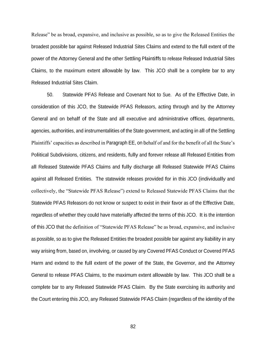 82 Release” be as broad, expansive, and inclusive as possible, so as to give the Released Entities the broadest possible bar against Released Industrial Sites Claims and extend to the full extent of the power of the Attorney General and the other Settling Plaintiffs to release Released Industrial Sites Claims, to the maximum extent allowable by law. This JCO shall be a complete bar to any Released Industrial Sites Claim. 50. Statewide PFAS Release and Covenant Not to Sue. As of the Effective Date, in consideration of this JCO, the Statewide PFAS Releasors, acting through and by the Attorney General and on behalf of the State and all executive and administrative offices, departments, agencies, authorities, and instrumentalities of the State government, and acting in all of the Settling Plaintiffs’ capacities as described in Paragraph EE, on behalf of and for the benefit of all the State’s Political Subdivisions, citizens, and residents, fully and forever release all Released Entities from all Released Statewide PFAS Claims and fully discharge all Released Statewide PFAS Claims against all Released Entities. The statewide releases provided for in this JCO (individually and collectively, the “Statewide PFAS Release”) extend to Released Statewide PFAS Claims that the Statewide PFAS Releasors do not know or suspect to exist in their favor as of the Effective Date, regardless of whether they could have materially affected the terms of this JCO. It is the intention of this JCO that the definition of “Statewide PFAS Release” be as broad, expansive, and inclusive as possible, so as to give the Released Entities the broadest possible bar against any liability in any way arising from, based on, involving, or caused by any Covered PFAS Conduct or Covered PFAS Harm and extend to the full extent of the power of the State, the Governor, and the Attorney General to release PFAS Claims, to the maximum extent allowable by law. This JCO shall be a complete bar to any Released Statewide PFAS Claim. By the State exercising its authority and the Court entering this JCO, any Released Statewide PFAS Claim (regardless of the identity of the