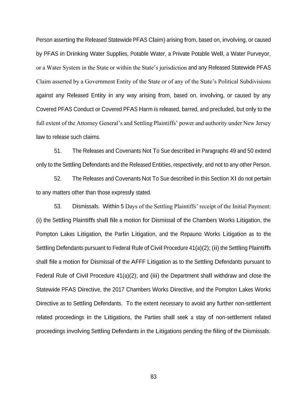 83 Person asserting the Released Statewide PFAS Claim) arising from, based on, involving, or caused by PFAS in Drinking Water Supplies, Potable Water, a Private Potable Well, a Water Purveyor, or a Water System in the State or within the State’s jurisdiction and any Released Statewide PFAS Claim asserted by a Government Entity of the State or of any of the State’s Political Subdivisions against any Released Entity in any way arising from, based on, involving, or caused by any Covered PFAS Conduct or Covered PFAS Harm is released, barred, and precluded, but only to the full extent of the Attorney General’s and Settling Plaintiffs’ power and authority under New Jersey law to release such claims. 51. The Releases and Covenants Not To Sue described in Paragraphs 49 and 50 extend only to the Settling Defendants and the Released Entities, respectively, and not to any other Person. 52. The Releases and Covenants Not To Sue described in this Section XI do not pertain to any matters other than those expressly stated. 53. Dismissals. Within 5 Days of the Settling Plaintiffs’ receipt of the Initial Payment: (i) the Settling Plaintiffs shall file a motion for Dismissal of the Chambers Works Litigation, the Pompton Lakes Litigation, the Parlin Litigation, and the Repauno Works Litigation as to the Settling Defendants pursuant to Federal Rule of Civil Procedure 41(a)(2); (ii) the Settling Plaintiffs shall file a motion for Dismissal of the AFFF Litigation as to the Settling Defendants pursuant to Federal Rule of Civil Procedure 41(a)(2); and (iii) the Department shall withdraw and close the Statewide PFAS Directive, the 2017 Chambers Works Directive, and the Pompton Lakes Works Directive as to Settling Defendants. To the extent necessary to avoid any further non-settlement related proceedings in the Litigations, the Parties shall seek a stay of non-settlement related proceedings involving Settling Defendants in the Litigations pending the filing of the Dismissals.
