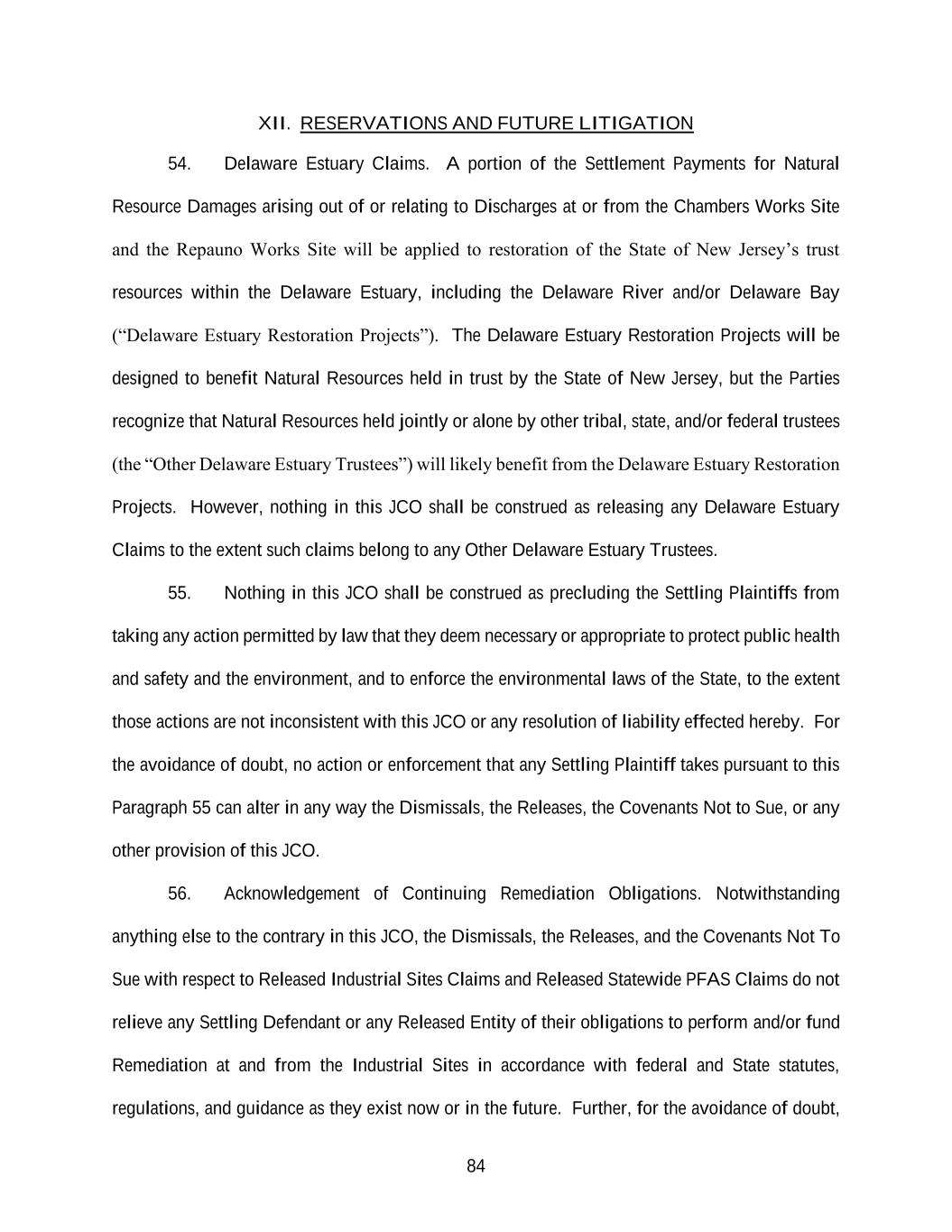 84 XII. RESERVATIONS AND FUTURE LITIGATION 54. Delaware Estuary Claims. A portion of the Settlement Payments for Natural Resource Damages arising out of or relating to Discharges at or from the Chambers Works Site and the Repauno Works Site will be applied to restoration of the State of New Jersey’s trust resources within the Delaware Estuary, including the Delaware River and/or Delaware Bay (“Delaware Estuary Restoration Projects”). The Delaware Estuary Restoration Projects will be designed to benefit Natural Resources held in trust by the State of New Jersey, but the Parties recognize that Natural Resources held jointly or alone by other tribal, state, and/or federal trustees (the “Other Delaware Estuary Trustees”) will likely benefit from the Delaware Estuary Restoration Projects. However, nothing in this JCO shall be construed as releasing any Delaware Estuary Claims to the extent such claims belong to any Other Delaware Estuary Trustees. 55. Nothing in this JCO shall be construed as precluding the Settling Plaintiffs from taking any action permitted by law that they deem necessary or appropriate to protect public health and safety and the environment, and to enforce the environmental laws of the State, to the extent those actions are not inconsistent with this JCO or any resolution of liability effected hereby. For the avoidance of doubt, no action or enforcement that any Settling Plaintiff takes pursuant to this Paragraph 55 can alter in any way the Dismissals, the Releases, the Covenants Not to Sue, or any other provision of this JCO. 56. Acknowledgement of Continuing Remediation Obligations. Notwithstanding anything else to the contrary in this JCO, the Dismissals, the Releases, and the Covenants Not To Sue with respect to Released Industrial Sites Claims and Released Statewide PFAS Claims do not relieve any Settling Defendant or any Released Entity of their obligations to perform and/or fund Remediation at and from the Industrial Sites in accordance with federal and State statutes, regulations, and guidance as they exist now or in the future. Further, for the avoidance of doubt,