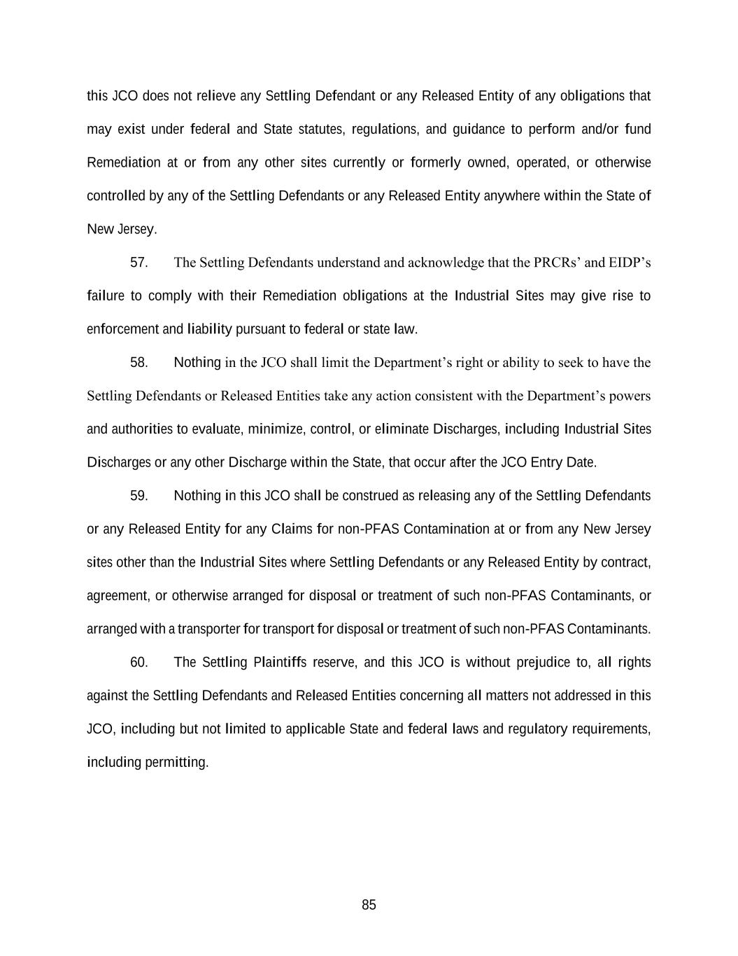 85 this JCO does not relieve any Settling Defendant or any Released Entity of any obligations that may exist under federal and State statutes, regulations, and guidance to perform and/or fund Remediation at or from any other sites currently or formerly owned, operated, or otherwise controlled by any of the Settling Defendants or any Released Entity anywhere within the State of New Jersey. 57. The Settling Defendants understand and acknowledge that the PRCRs’ and EIDP’s failure to comply with their Remediation obligations at the Industrial Sites may give rise to enforcement and liability pursuant to federal or state law. 58. Nothing in the JCO shall limit the Department’s right or ability to seek to have the Settling Defendants or Released Entities take any action consistent with the Department’s powers and authorities to evaluate, minimize, control, or eliminate Discharges, including Industrial Sites Discharges or any other Discharge within the State, that occur after the JCO Entry Date. 59. Nothing in this JCO shall be construed as releasing any of the Settling Defendants or any Released Entity for any Claims for non-PFAS Contamination at or from any New Jersey sites other than the Industrial Sites where Settling Defendants or any Released Entity by contract, agreement, or otherwise arranged for disposal or treatment of such non-PFAS Contaminants, or arranged with a transporter for transport for disposal or treatment of such non-PFAS Contaminants. 60. The Settling Plaintiffs reserve, and this JCO is without prejudice to, all rights against the Settling Defendants and Released Entities concerning all matters not addressed in this JCO, including but not limited to applicable State and federal laws and regulatory requirements, including permitting.
