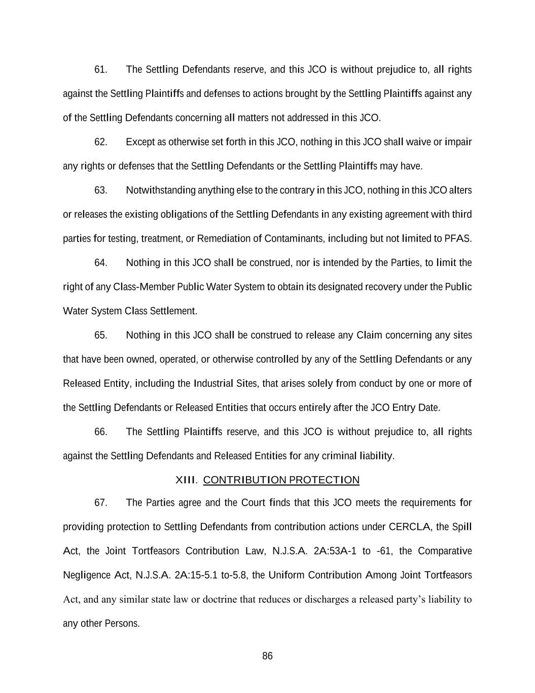 86 61. The Settling Defendants reserve, and this JCO is without prejudice to, all rights against the Settling Plaintiffs and defenses to actions brought by the Settling Plaintiffs against any of the Settling Defendants concerning all matters not addressed in this JCO. 62. Except as otherwise set forth in this JCO, nothing in this JCO shall waive or impair any rights or defenses that the Settling Defendants or the Settling Plaintiffs may have. 63. Notwithstanding anything else to the contrary in this JCO, nothing in this JCO alters or releases the existing obligations of the Settling Defendants in any existing agreement with third parties for testing, treatment, or Remediation of Contaminants, including but not limited to PFAS. 64. Nothing in this JCO shall be construed, nor is intended by the Parties, to limit the right of any Class-Member Public Water System to obtain its designated recovery under the Public Water System Class Settlement. 65. Nothing in this JCO shall be construed to release any Claim concerning any sites that have been owned, operated, or otherwise controlled by any of the Settling Defendants or any Released Entity, including the Industrial Sites, that arises solely from conduct by one or more of the Settling Defendants or Released Entities that occurs entirely after the JCO Entry Date. 66. The Settling Plaintiffs reserve, and this JCO is without prejudice to, all rights against the Settling Defendants and Released Entities for any criminal liability. XIII. CONTRIBUTION PROTECTION 67. The Parties agree and the Court finds that this JCO meets the requirements for providing protection to Settling Defendants from contribution actions under CERCLA, the Spill Act, the Joint Tortfeasors Contribution Law, N.J.S.A. 2A:53A-1 to -61, the Comparative Negligence Act, N.J.S.A. 2A:15-5.1 to-5.8, the Uniform Contribution Among Joint Tortfeasors Act, and any similar state law or doctrine that reduces or discharges a released party’s liability to any other Persons.