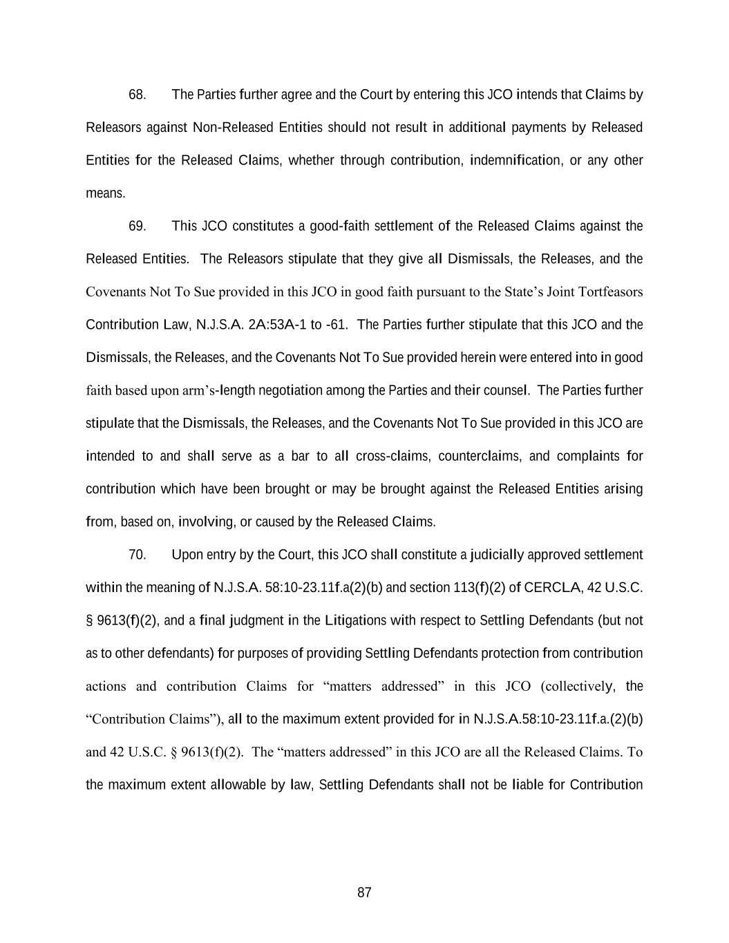 87 68. The Parties further agree and the Court by entering this JCO intends that Claims by Releasors against Non-Released Entities should not result in additional payments by Released Entities for the Released Claims, whether through contribution, indemnification, or any other means. 69. This JCO constitutes a good-faith settlement of the Released Claims against the Released Entities. The Releasors stipulate that they give all Dismissals, the Releases, and the Covenants Not To Sue provided in this JCO in good faith pursuant to the State’s Joint Tortfeasors Contribution Law, N.J.S.A. 2A:53A-1 to -61. The Parties further stipulate that this JCO and the Dismissals, the Releases, and the Covenants Not To Sue provided herein were entered into in good faith based upon arm’s-length negotiation among the Parties and their counsel. The Parties further stipulate that the Dismissals, the Releases, and the Covenants Not To Sue provided in this JCO are intended to and shall serve as a bar to all cross-claims, counterclaims, and complaints for contribution which have been brought or may be brought against the Released Entities arising from, based on, involving, or caused by the Released Claims. 70. Upon entry by the Court, this JCO shall constitute a judicially approved settlement within the meaning of N.J.S.A. 58:10-23.11f.a(2)(b) and section 113(f)(2) of CERCLA, 42 U.S.C. § 9613(f)(2), and a final judgment in the Litigations with respect to Settling Defendants (but not as to other defendants) for purposes of providing Settling Defendants protection from contribution actions and contribution Claims for “matters addressed” in this JCO (collectively, the “Contribution Claims”), all to the maximum extent provided for in N.J.S.A.58:10-23.11f.a.(2)(b) and 42 U.S.C. § 9613(f)(2). The “matters addressed” in this JCO are all the Released Claims. To the maximum extent allowable by law, Settling Defendants shall not be liable for Contribution