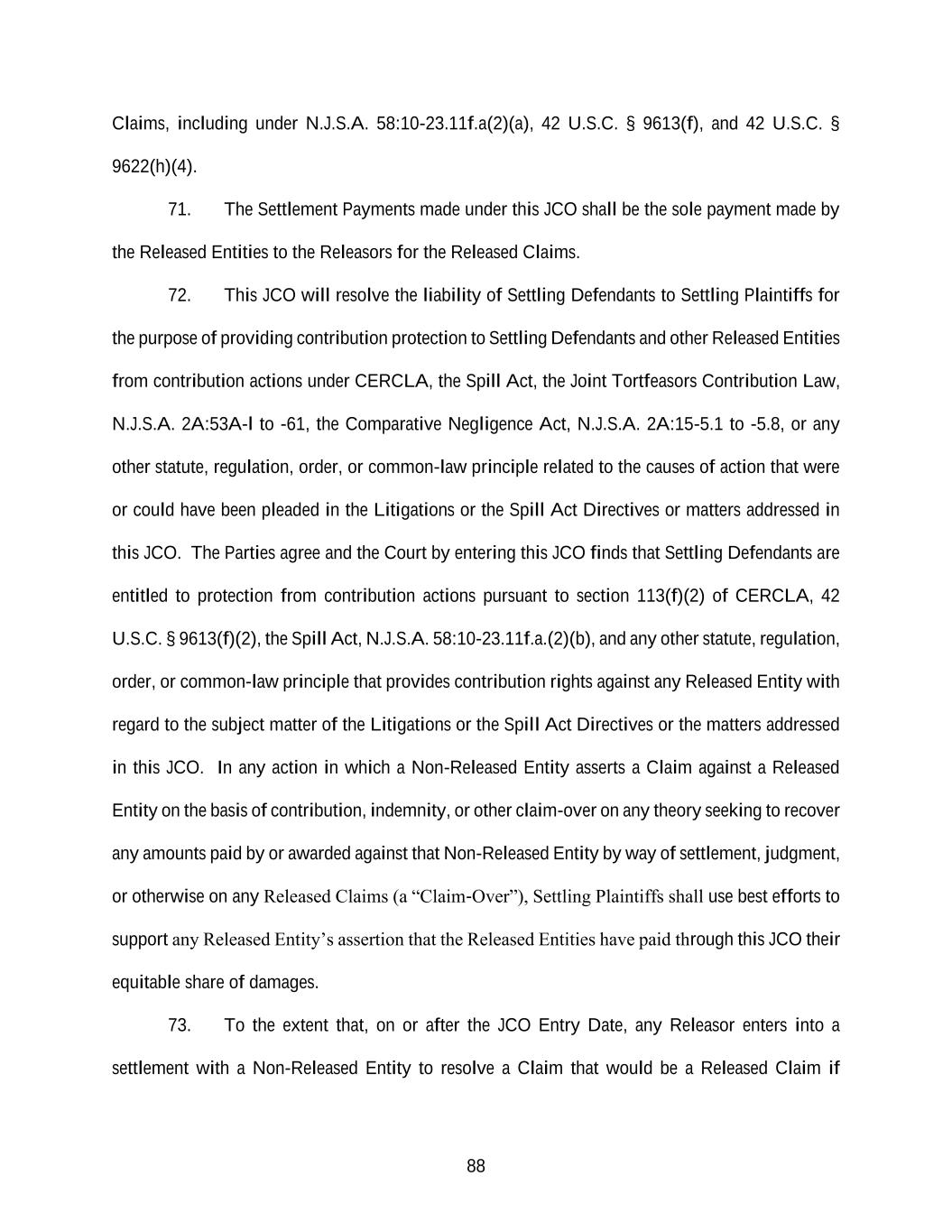 88 Claims, including under N.J.S.A. 58:10-23.11f.a(2)(a), 42 U.S.C. § 9613(f), and 42 U.S.C. § 9622(h)(4). 71. The Settlement Payments made under this JCO shall be the sole payment made by the Released Entities to the Releasors for the Released Claims. 72. This JCO will resolve the liability of Settling Defendants to Settling Plaintiffs for the purpose of providing contribution protection to Settling Defendants and other Released Entities from contribution actions under CERCLA, the Spill Act, the Joint Tortfeasors Contribution Law, N.J.S.A. 2A:53A-l to -61, the Comparative Negligence Act, N.J.S.A. 2A:15-5.1 to -5.8, or any other statute, regulation, order, or common-law principle related to the causes of action that were or could have been pleaded in the Litigations or the Spill Act Directives or matters addressed in this JCO. The Parties agree and the Court by entering this JCO finds that Settling Defendants are entitled to protection from contribution actions pursuant to section 113(f)(2) of CERCLA, 42 U.S.C. § 9613(f)(2), the Spill Act, N.J.S.A. 58:10-23.11f.a.(2)(b), and any other statute, regulation, order, or common-law principle that provides contribution rights against any Released Entity with regard to the subject matter of the Litigations or the Spill Act Directives or the matters addressed in this JCO. In any action in which a Non-Released Entity asserts a Claim against a Released Entity on the basis of contribution, indemnity, or other claim-over on any theory seeking to recover any amounts paid by or awarded against that Non-Released Entity by way of settlement, judgment, or otherwise on any Released Claims (a “Claim-Over”), Settling Plaintiffs shall use best efforts to support any Released Entity’s assertion that the Released Entities have paid through this JCO their equitable share of damages. 73. To the extent that, on or after the JCO Entry Date, any Releasor enters into a settlement with a Non-Released Entity to resolve a Claim that would be a Released Claim if
