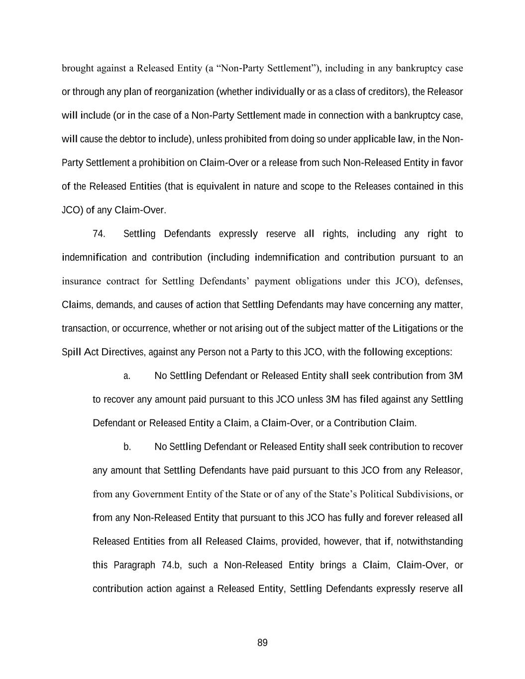 89 brought against a Released Entity (a “Non-Party Settlement”), including in any bankruptcy case or through any plan of reorganization (whether individually or as a class of creditors), the Releasor will include (or in the case of a Non-Party Settlement made in connection with a bankruptcy case, will cause the debtor to include), unless prohibited from doing so under applicable law, in the Non- Party Settlement a prohibition on Claim-Over or a release from such Non-Released Entity in favor of the Released Entities (that is equivalent in nature and scope to the Releases contained in this JCO) of any Claim-Over. 74. Settling Defendants expressly reserve all rights, including any right to indemnification and contribution (including indemnification and contribution pursuant to an insurance contract for Settling Defendants’ payment obligations under this JCO), defenses, Claims, demands, and causes of action that Settling Defendants may have concerning any matter, transaction, or occurrence, whether or not arising out of the subject matter of the Litigations or the Spill Act Directives, against any Person not a Party to this JCO, with the following exceptions: a. No Settling Defendant or Released Entity shall seek contribution from 3M to recover any amount paid pursuant to this JCO unless 3M has filed against any Settling Defendant or Released Entity a Claim, a Claim-Over, or a Contribution Claim. b. No Settling Defendant or Released Entity shall seek contribution to recover any amount that Settling Defendants have paid pursuant to this JCO from any Releasor, from any Government Entity of the State or of any of the State’s Political Subdivisions, or from any Non-Released Entity that pursuant to this JCO has fully and forever released all Released Entities from all Released Claims, provided, however, that if, notwithstanding this Paragraph 74.b, such a Non-Released Entity brings a Claim, Claim-Over, or contribution action against a Released Entity, Settling Defendants expressly reserve all