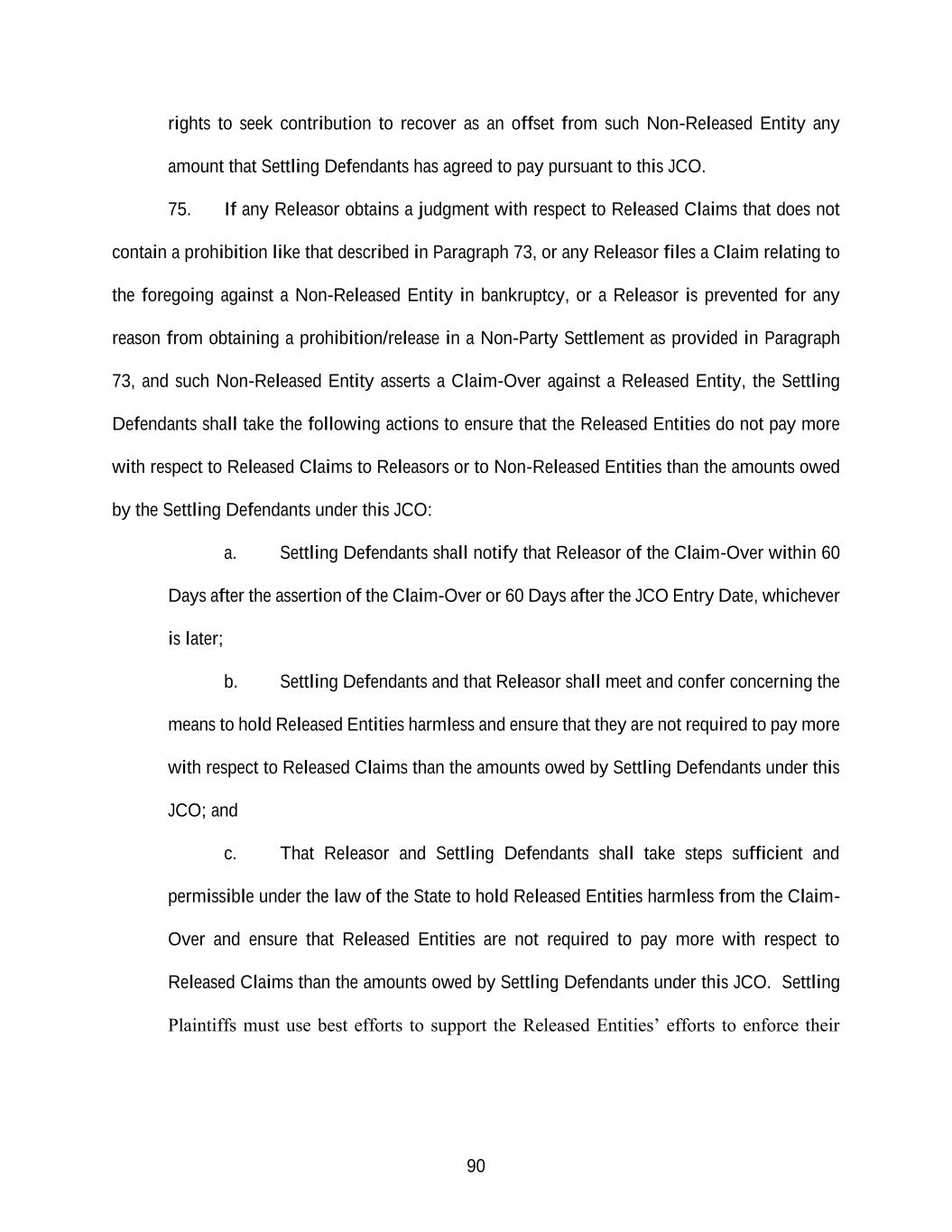 90 rights to seek contribution to recover as an offset from such Non-Released Entity any amount that Settling Defendants has agreed to pay pursuant to this JCO. 75. If any Releasor obtains a judgment with respect to Released Claims that does not contain a prohibition like that described in Paragraph 73, or any Releasor files a Claim relating to the foregoing against a Non-Released Entity in bankruptcy, or a Releasor is prevented for any reason from obtaining a prohibition/release in a Non-Party Settlement as provided in Paragraph 73, and such Non-Released Entity asserts a Claim-Over against a Released Entity, the Settling Defendants shall take the following actions to ensure that the Released Entities do not pay more with respect to Released Claims to Releasors or to Non-Released Entities than the amounts owed by the Settling Defendants under this JCO: a. Settling Defendants shall notify that Releasor of the Claim-Over within 60 Days after the assertion of the Claim-Over or 60 Days after the JCO Entry Date, whichever is later; b. Settling Defendants and that Releasor shall meet and confer concerning the means to hold Released Entities harmless and ensure that they are not required to pay more with respect to Released Claims than the amounts owed by Settling Defendants under this JCO; and c. That Releasor and Settling Defendants shall take steps sufficient and permissible under the law of the State to hold Released Entities harmless from the Claim- Over and ensure that Released Entities are not required to pay more with respect to Released Claims than the amounts owed by Settling Defendants under this JCO. Settling Plaintiffs must use best efforts to support the Released Entities’ efforts to enforce their