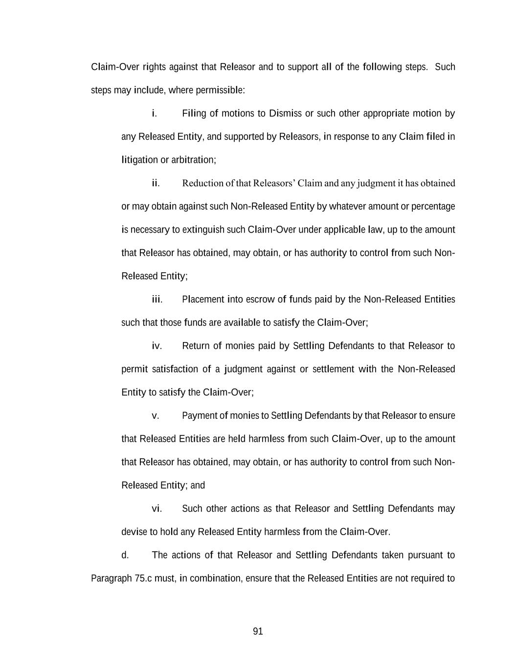 91 Claim-Over rights against that Releasor and to support all of the following steps. Such steps may include, where permissible: i. Filing of motions to Dismiss or such other appropriate motion by any Released Entity, and supported by Releasors, in response to any Claim filed in litigation or arbitration; ii. Reduction of that Releasors’ Claim and any judgment it has obtained or may obtain against such Non-Released Entity by whatever amount or percentage is necessary to extinguish such Claim-Over under applicable law, up to the amount that Releasor has obtained, may obtain, or has authority to control from such Non- Released Entity; iii. Placement into escrow of funds paid by the Non-Released Entities such that those funds are available to satisfy the Claim-Over; iv. Return of monies paid by Settling Defendants to that Releasor to permit satisfaction of a judgment against or settlement with the Non-Released Entity to satisfy the Claim-Over; v. Payment of monies to Settling Defendants by that Releasor to ensure that Released Entities are held harmless from such Claim-Over, up to the amount that Releasor has obtained, may obtain, or has authority to control from such Non- Released Entity; and vi. Such other actions as that Releasor and Settling Defendants may devise to hold any Released Entity harmless from the Claim-Over. d. The actions of that Releasor and Settling Defendants taken pursuant to Paragraph 75.c must, in combination, ensure that the Released Entities are not required to