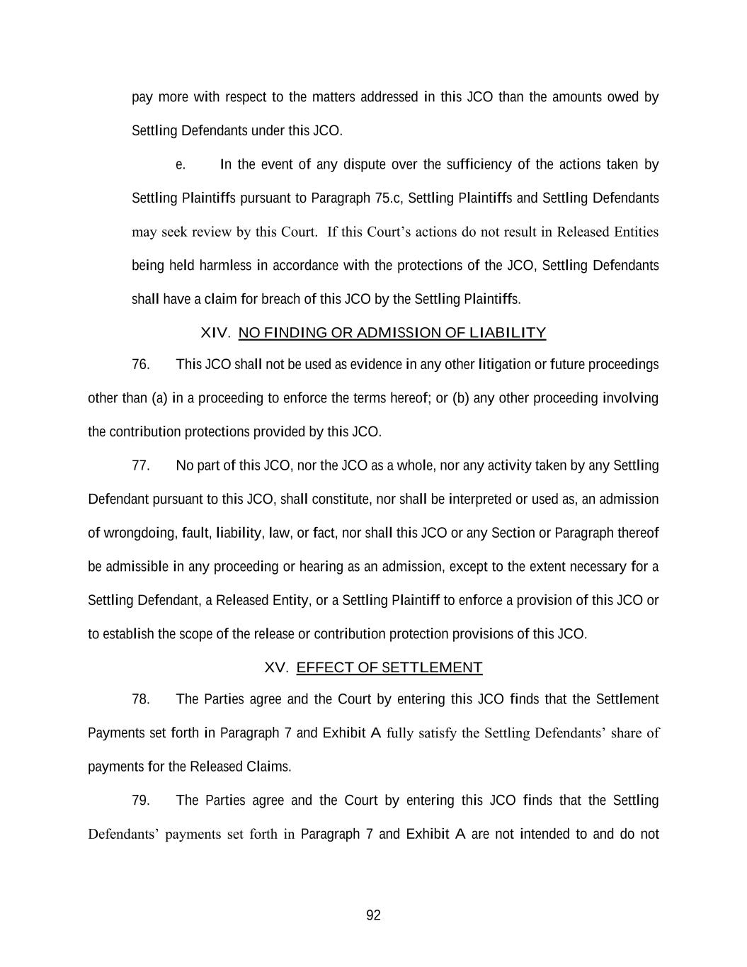 92 pay more with respect to the matters addressed in this JCO than the amounts owed by Settling Defendants under this JCO. e. In the event of any dispute over the sufficiency of the actions taken by Settling Plaintiffs pursuant to Paragraph 75.c, Settling Plaintiffs and Settling Defendants may seek review by this Court. If this Court’s actions do not result in Released Entities being held harmless in accordance with the protections of the JCO, Settling Defendants shall have a claim for breach of this JCO by the Settling Plaintiffs. XIV. NO FINDING OR ADMISSION OF LIABILITY 76. This JCO shall not be used as evidence in any other litigation or future proceedings other than (a) in a proceeding to enforce the terms hereof; or (b) any other proceeding involving the contribution protections provided by this JCO. 77. No part of this JCO, nor the JCO as a whole, nor any activity taken by any Settling Defendant pursuant to this JCO, shall constitute, nor shall be interpreted or used as, an admission of wrongdoing, fault, liability, law, or fact, nor shall this JCO or any Section or Paragraph thereof be admissible in any proceeding or hearing as an admission, except to the extent necessary for a Settling Defendant, a Released Entity, or a Settling Plaintiff to enforce a provision of this JCO or to establish the scope of the release or contribution protection provisions of this JCO. XV. EFFECT OF SETTLEMENT 78. The Parties agree and the Court by entering this JCO finds that the Settlement Payments set forth in Paragraph 7 and Exhibit A fully satisfy the Settling Defendants’ share of payments for the Released Claims. 79. The Parties agree and the Court by entering this JCO finds that the Settling Defendants’ payments set forth in Paragraph 7 and Exhibit A are not intended to and do not