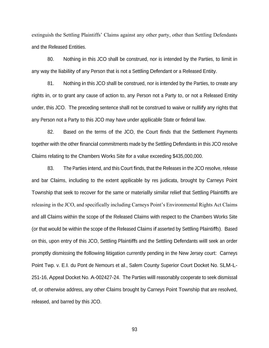 93 extinguish the Settling Plaintiffs’ Claims against any other party, other than Settling Defendants and the Released Entities. 80. Nothing in this JCO shall be construed, nor is intended by the Parties, to limit in any way the liability of any Person that is not a Settling Defendant or a Released Entity. 81. Nothing in this JCO shall be construed, nor is intended by the Parties, to create any rights in, or to grant any cause of action to, any Person not a Party to, or not a Released Entity under, this JCO. The preceding sentence shall not be construed to waive or nullify any rights that any Person not a Party to this JCO may have under applicable State or federal law. 82. Based on the terms of the JCO, the Court finds that the Settlement Payments together with the other financial commitments made by the Settling Defendants in this JCO resolve Claims relating to the Chambers Works Site for a value exceeding $435,000,000. 83. The Parties intend, and this Court finds, that the Releases in the JCO resolve, release and bar Claims, including to the extent applicable by res judicata, brought by Carneys Point Township that seek to recover for the same or materially similar relief that Settling Plaintiffs are releasing in the JCO, and specifically including Carneys Point’s Environmental Rights Act Claims and all Claims within the scope of the Released Claims with respect to the Chambers Works Site (or that would be within the scope of the Released Claims if asserted by Settling Plaintiffs). Based on this, upon entry of this JCO, Settling Plaintiffs and the Settling Defendants will seek an order promptly dismissing the following litigation currently pending in the New Jersey court: Carneys Point Twp. v. E.I. du Pont de Nemours et al., Salem County Superior Court Docket No. SLM-L- 251-16, Appeal Docket No. A-002427-24. The Parties will reasonably cooperate to seek dismissal of, or otherwise address, any other Claims brought by Carneys Point Township that are resolved, released, and barred by this JCO.