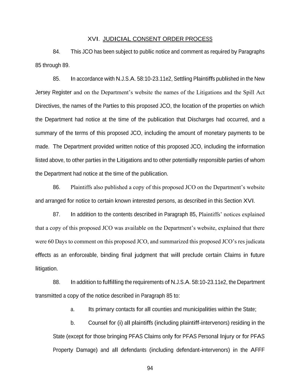 94 XVI. JUDICIAL CONSENT ORDER PROCESS 84. This JCO has been subject to public notice and comment as required by Paragraphs 85 through 89. 85. In accordance with N.J.S.A. 58:10-23.11e2, Settling Plaintiffs published in the New Jersey Register and on the Department’s website the names of the Litigations and the Spill Act Directives, the names of the Parties to this proposed JCO, the location of the properties on which the Department had notice at the time of the publication that Discharges had occurred, and a summary of the terms of this proposed JCO, including the amount of monetary payments to be made. The Department provided written notice of this proposed JCO, including the information listed above, to other parties in the Litigations and to other potentially responsible parties of whom the Department had notice at the time of the publication. 86. Plaintiffs also published a copy of this proposed JCO on the Department’s website and arranged for notice to certain known interested persons, as described in this Section XVI. 87. In addition to the contents described in Paragraph 85, Plaintiffs’ notices explained that a copy of this proposed JCO was available on the Department’s website, explained that there were 60 Days to comment on this proposed JCO, and summarized this proposed JCO’s res judicata effects as an enforceable, binding final judgment that will preclude certain Claims in future litigation. 88. In addition to fulfilling the requirements of N.J.S.A. 58:10-23.11e2, the Department transmitted a copy of the notice described in Paragraph 85 to: a. Its primary contacts for all counties and municipalities within the State; b. Counsel for (i) all plaintiffs (including plaintiff-intervenors) residing in the State (except for those bringing PFAS Claims only for PFAS Personal Injury or for PFAS Property Damage) and all defendants (including defendant-intervenors) in the AFFF