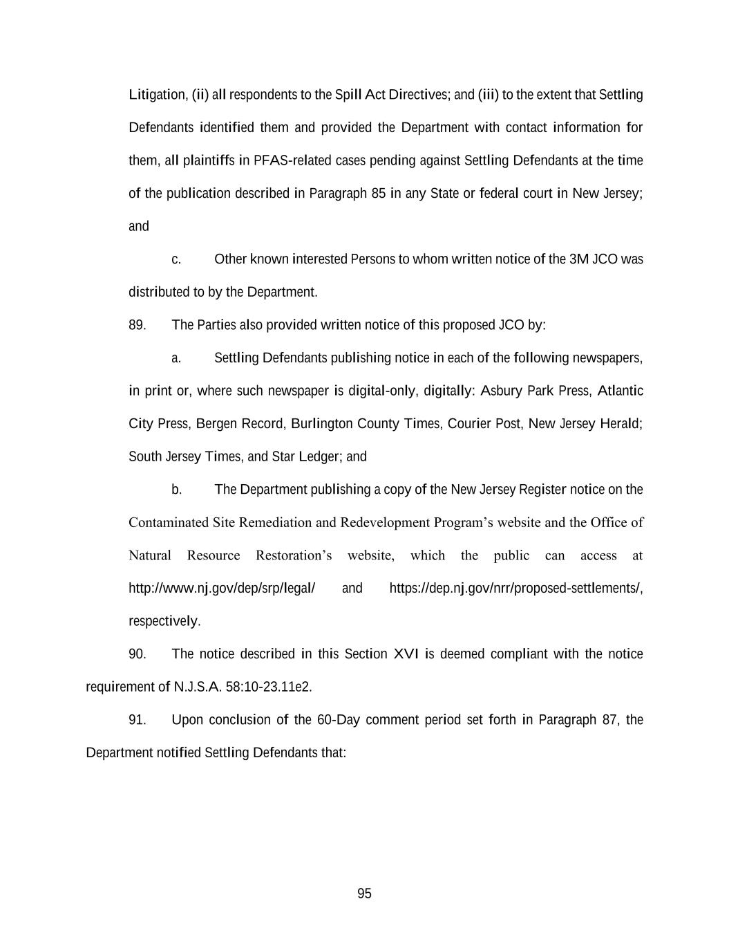 95 Litigation, (ii) all respondents to the Spill Act Directives; and (iii) to the extent that Settling Defendants identified them and provided the Department with contact information for them, all plaintiffs in PFAS-related cases pending against Settling Defendants at the time of the publication described in Paragraph 85 in any State or federal court in New Jersey; and c. Other known interested Persons to whom written notice of the 3M JCO was distributed to by the Department. 89. The Parties also provided written notice of this proposed JCO by: a. Settling Defendants publishing notice in each of the following newspapers, in print or, where such newspaper is digital-only, digitally: Asbury Park Press, Atlantic City Press, Bergen Record, Burlington County Times, Courier Post, New Jersey Herald; South Jersey Times, and Star Ledger; and b. The Department publishing a copy of the New Jersey Register notice on the Contaminated Site Remediation and Redevelopment Program’s website and the Office of Natural Resource Restoration’s website, which the public can access at http://www.nj.gov/dep/srp/legal/ and https://dep.nj.gov/nrr/proposed-settlements/, respectively. 90. The notice described in this Section XVI is deemed compliant with the notice requirement of N.J.S.A. 58:10-23.11e2. 91. Upon conclusion of the 60-Day comment period set forth in Paragraph 87, the Department notified Settling Defendants that: