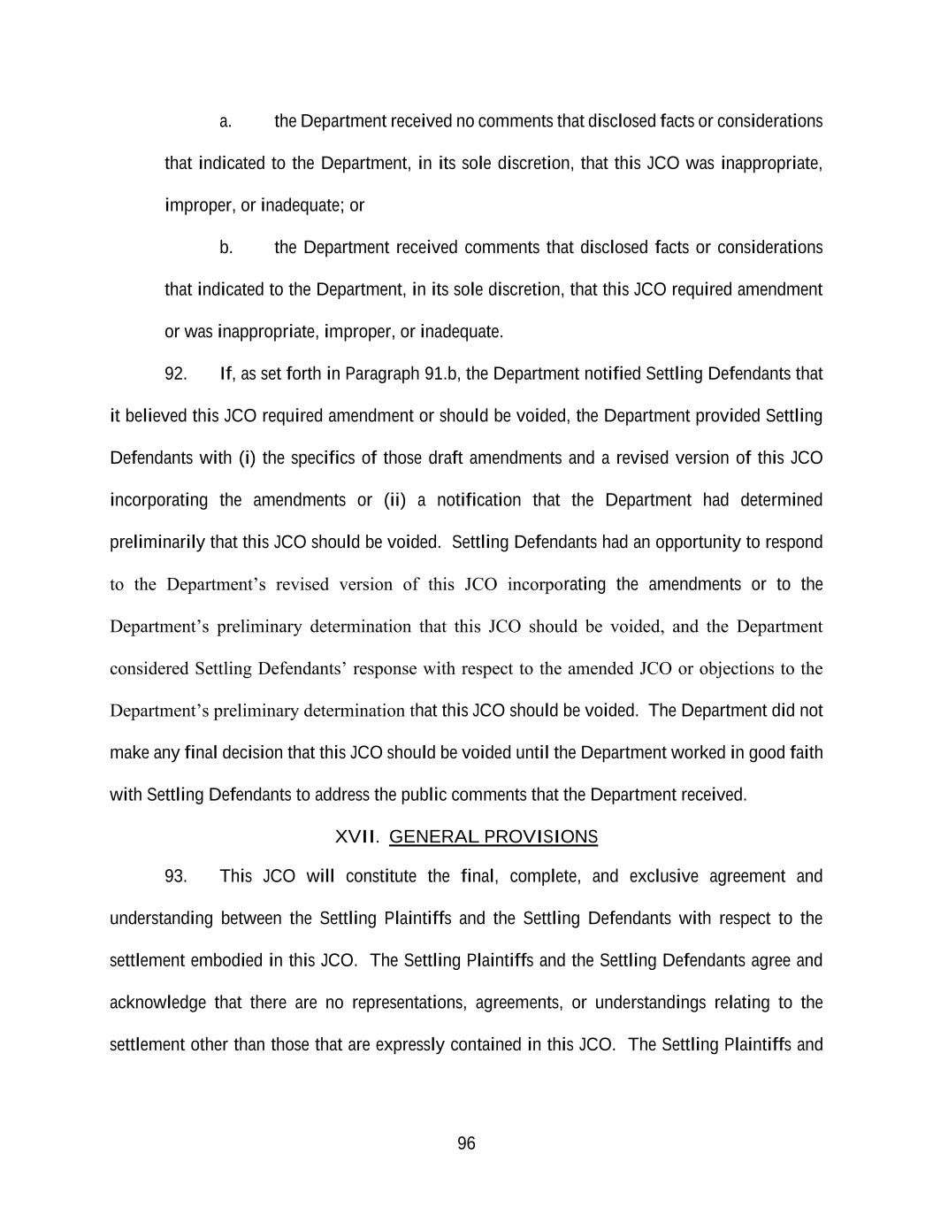 96 a. the Department received no comments that disclosed facts or considerations that indicated to the Department, in its sole discretion, that this JCO was inappropriate, improper, or inadequate; or b. the Department received comments that disclosed facts or considerations that indicated to the Department, in its sole discretion, that this JCO required amendment or was inappropriate, improper, or inadequate. 92. If, as set forth in Paragraph 91.b, the Department notified Settling Defendants that it believed this JCO required amendment or should be voided, the Department provided Settling Defendants with (i) the specifics of those draft amendments and a revised version of this JCO incorporating the amendments or (ii) a notification that the Department had determined preliminarily that this JCO should be voided. Settling Defendants had an opportunity to respond to the Department’s revised version of this JCO incorporating the amendments or to the Department’s preliminary determination that this JCO should be voided, and the Department considered Settling Defendants’ response with respect to the amended JCO or objections to the Department’s preliminary determination that this JCO should be voided. The Department did not make any final decision that this JCO should be voided until the Department worked in good faith with Settling Defendants to address the public comments that the Department received. XVII. GENERAL PROVISIONS 93. This JCO will constitute the final, complete, and exclusive agreement and understanding between the Settling Plaintiffs and the Settling Defendants with respect to the settlement embodied in this JCO. The Settling Plaintiffs and the Settling Defendants agree and acknowledge that there are no representations, agreements, or understandings relating to the settlement other than those that are expressly contained in this JCO. The Settling Plaintiffs and