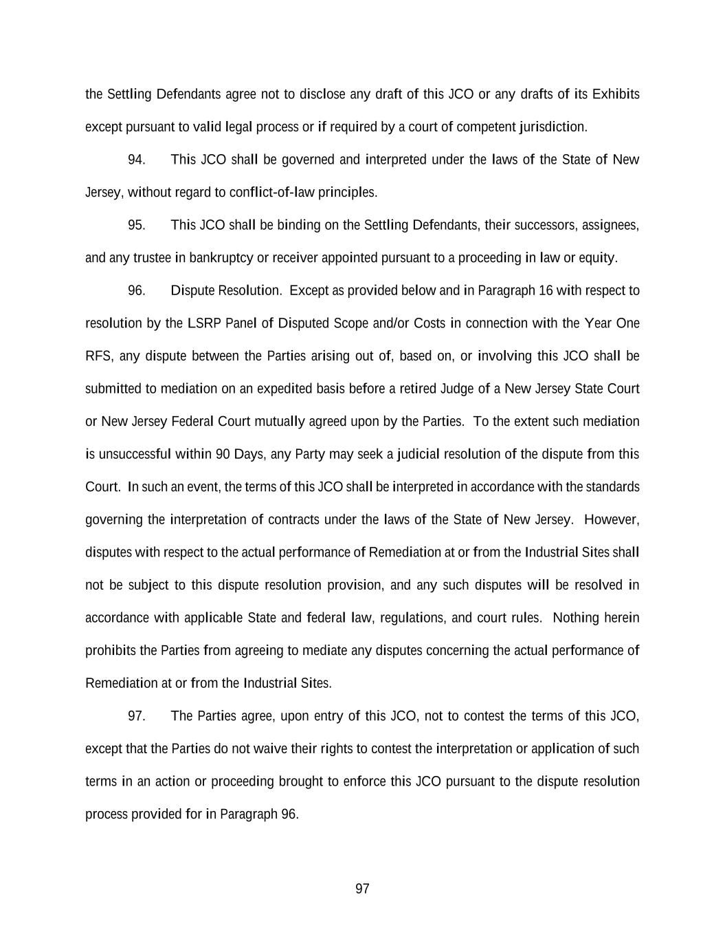 97 the Settling Defendants agree not to disclose any draft of this JCO or any drafts of its Exhibits except pursuant to valid legal process or if required by a court of competent jurisdiction. 94. This JCO shall be governed and interpreted under the laws of the State of New Jersey, without regard to conflict-of-law principles. 95. This JCO shall be binding on the Settling Defendants, their successors, assignees, and any trustee in bankruptcy or receiver appointed pursuant to a proceeding in law or equity. 96. Dispute Resolution. Except as provided below and in Paragraph 16 with respect to resolution by the LSRP Panel of Disputed Scope and/or Costs in connection with the Year One RFS, any dispute between the Parties arising out of, based on, or involving this JCO shall be submitted to mediation on an expedited basis before a retired Judge of a New Jersey State Court or New Jersey Federal Court mutually agreed upon by the Parties. To the extent such mediation is unsuccessful within 90 Days, any Party may seek a judicial resolution of the dispute from this Court. In such an event, the terms of this JCO shall be interpreted in accordance with the standards governing the interpretation of contracts under the laws of the State of New Jersey. However, disputes with respect to the actual performance of Remediation at or from the Industrial Sites shall not be subject to this dispute resolution provision, and any such disputes will be resolved in accordance with applicable State and federal law, regulations, and court rules. Nothing herein prohibits the Parties from agreeing to mediate any disputes concerning the actual performance of Remediation at or from the Industrial Sites. 97. The Parties agree, upon entry of this JCO, not to contest the terms of this JCO, except that the Parties do not waive their rights to contest the interpretation or application of such terms in an action or proceeding brought to enforce this JCO pursuant to the dispute resolution process provided for in Paragraph 96.