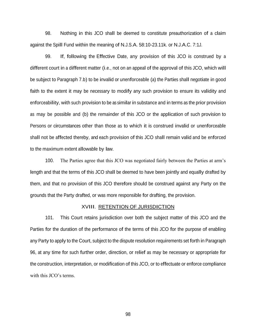 98 98. Nothing in this JCO shall be deemed to constitute preauthorization of a claim against the Spill Fund within the meaning of N.J.S.A. 58:10-23.11k. or N.J.A.C. 7:1J. 99. If, following the Effective Date, any provision of this JCO is construed by a different court in a different matter (i.e., not on an appeal of the approval of this JCO, which will be subject to Paragraph 7.b) to be invalid or unenforceable (a) the Parties shall negotiate in good faith to the extent it may be necessary to modify any such provision to ensure its validity and enforceability, with such provision to be as similar in substance and in terms as the prior provision as may be possible and (b) the remainder of this JCO or the application of such provision to Persons or circumstances other than those as to which it is construed invalid or unenforceable shall not be affected thereby, and each provision of this JCO shall remain valid and be enforced to the maximum extent allowable by law. 100. The Parties agree that this JCO was negotiated fairly between the Parties at arm’s length and that the terms of this JCO shall be deemed to have been jointly and equally drafted by them, and that no provision of this JCO therefore should be construed against any Party on the grounds that the Party drafted, or was more responsible for drafting, the provision. XVIII. RETENTION OF JURISDICTION 101. This Court retains jurisdiction over both the subject matter of this JCO and the Parties for the duration of the performance of the terms of this JCO for the purpose of enabling any Party to apply to the Court, subject to the dispute resolution requirements set forth in Paragraph 96, at any time for such further order, direction, or relief as may be necessary or appropriate for the construction, interpretation, or modification of this JCO, or to effectuate or enforce compliance with this JCO’s terms.