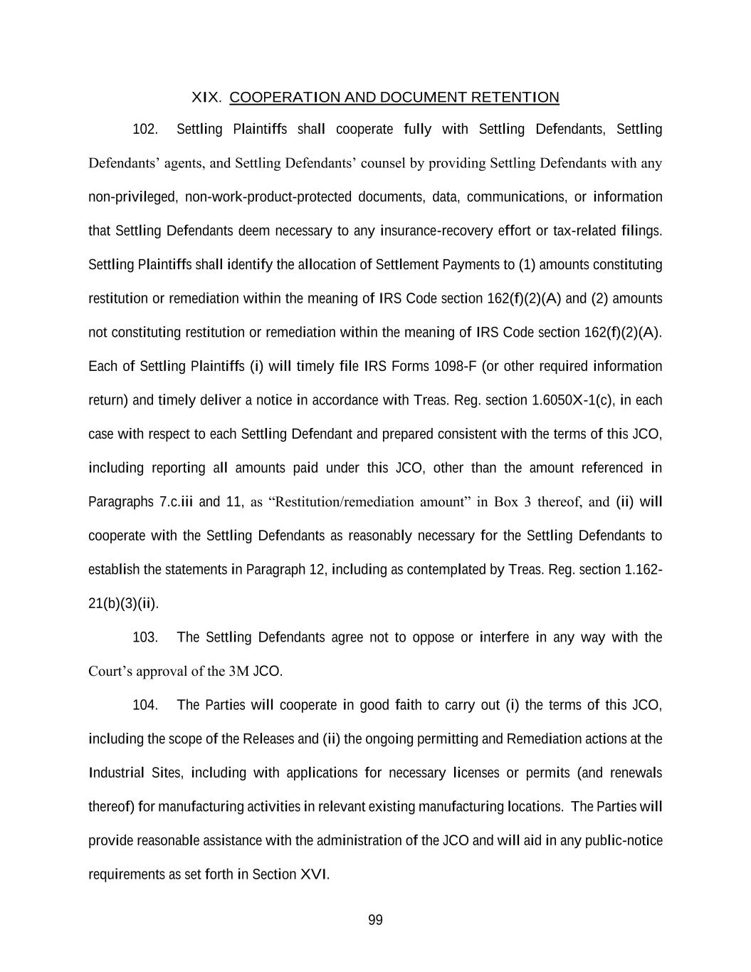 99 XIX. COOPERATION AND DOCUMENT RETENTION 102. Settling Plaintiffs shall cooperate fully with Settling Defendants, Settling Defendants’ agents, and Settling Defendants’ counsel by providing Settling Defendants with any non-privileged, non-work-product-protected documents, data, communications, or information that Settling Defendants deem necessary to any insurance-recovery effort or tax-related filings. Settling Plaintiffs shall identify the allocation of Settlement Payments to (1) amounts constituting restitution or remediation within the meaning of IRS Code section 162(f)(2)(A) and (2) amounts not constituting restitution or remediation within the meaning of IRS Code section 162(f)(2)(A). Each of Settling Plaintiffs (i) will timely file IRS Forms 1098-F (or other required information return) and timely deliver a notice in accordance with Treas. Reg. section 1.6050X-1(c), in each case with respect to each Settling Defendant and prepared consistent with the terms of this JCO, including reporting all amounts paid under this JCO, other than the amount referenced in Paragraphs 7.c.iii and 11, as “Restitution/remediation amount” in Box 3 thereof, and (ii) will cooperate with the Settling Defendants as reasonably necessary for the Settling Defendants to establish the statements in Paragraph 12, including as contemplated by Treas. Reg. section 1.162- 21(b)(3)(ii). 103. The Settling Defendants agree not to oppose or interfere in any way with the Court’s approval of the 3M JCO. 104. The Parties will cooperate in good faith to carry out (i) the terms of this JCO, including the scope of the Releases and (ii) the ongoing permitting and Remediation actions at the Industrial Sites, including with applications for necessary licenses or permits (and renewals thereof) for manufacturing activities in relevant existing manufacturing locations. The Parties will provide reasonable assistance with the administration of the JCO and will aid in any public-notice requirements as set forth in Section XVI.