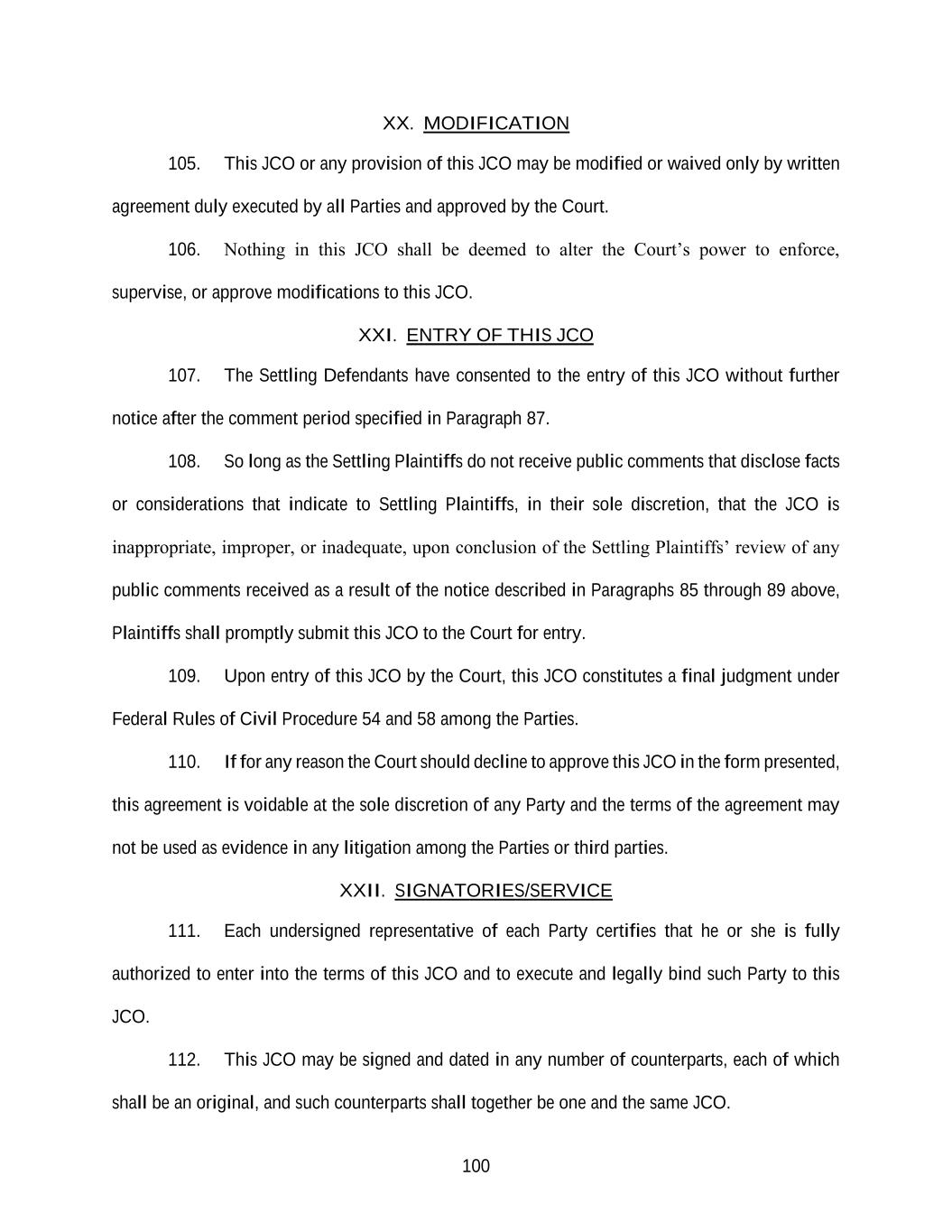 100 XX. MODIFICATION 105. This JCO or any provision of this JCO may be modified or waived only by written agreement duly executed by all Parties and approved by the Court. 106. Nothing in this JCO shall be deemed to alter the Court’s power to enforce, supervise, or approve modifications to this JCO. XXI. ENTRY OF THIS JCO 107. The Settling Defendants have consented to the entry of this JCO without further notice after the comment period specified in Paragraph 87. 108. So long as the Settling Plaintiffs do not receive public comments that disclose facts or considerations that indicate to Settling Plaintiffs, in their sole discretion, that the JCO is inappropriate, improper, or inadequate, upon conclusion of the Settling Plaintiffs’ review of any public comments received as a result of the notice described in Paragraphs 85 through 89 above, Plaintiffs shall promptly submit this JCO to the Court for entry. 109. Upon entry of this JCO by the Court, this JCO constitutes a final judgment under Federal Rules of Civil Procedure 54 and 58 among the Parties. 110. If for any reason the Court should decline to approve this JCO in the form presented, this agreement is voidable at the sole discretion of any Party and the terms of the agreement may not be used as evidence in any litigation among the Parties or third parties. XXII. SIGNATORIES/SERVICE 111. Each undersigned representative of each Party certifies that he or she is fully authorized to enter into the terms of this JCO and to execute and legally bind such Party to this JCO. 112. This JCO may be signed and dated in any number of counterparts, each of which shall be an original, and such counterparts shall together be one and the same JCO.