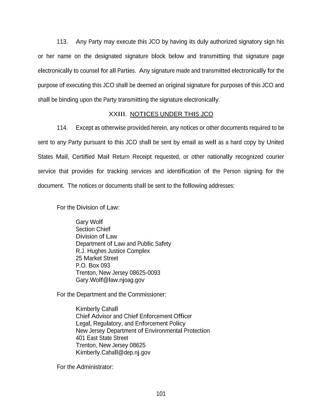 101 113. Any Party may execute this JCO by having its duly authorized signatory sign his or her name on the designated signature block below and transmitting that signature page electronically to counsel for all Parties. Any signature made and transmitted electronically for the purpose of executing this JCO shall be deemed an original signature for purposes of this JCO and shall be binding upon the Party transmitting the signature electronically. XXIII. NOTICES UNDER THIS JCO 114. Except as otherwise provided herein, any notices or other documents required to be sent to any Party pursuant to this JCO shall be sent by email as well as a hard copy by United States Mail, Certified Mail Return Receipt requested, or other nationally recognized courier service that provides for tracking services and identification of the Person signing for the document. The notices or documents shall be sent to the following addresses: For the Division of Law: Gary Wolf Section Chief Division of Law Department of Law and Public Safety R.J. Hughes Justice Complex 25 Market Street P.O. Box 093 Trenton, New Jersey 08625-0093 Gary.Wolf@law.njoag.gov For the Department and the Commissioner: Kimberly Cahall Chief Advisor and Chief Enforcement Officer Legal, Regulatory, and Enforcement Policy New Jersey Department of Environmental Protection 401 East State Street Trenton, New Jersey 08625 Kimberly.Cahall@dep.nj.gov For the Administrator: